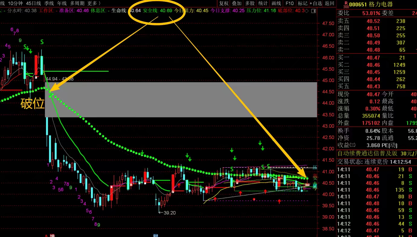 $格力电器(SZ000651)$ 前段时间分析过,格力中期破位后,就没啥参与价值了,现在回头看,没啥毛病,接下来要关注就看头上的安全线40.69位置什么时候能突破站稳,同时小幅度有抬头的趋势,那就可以考虑轻仓尝试,不然就管住手,等待为主,不要纠结。#复盘记录# #炒股日记#
