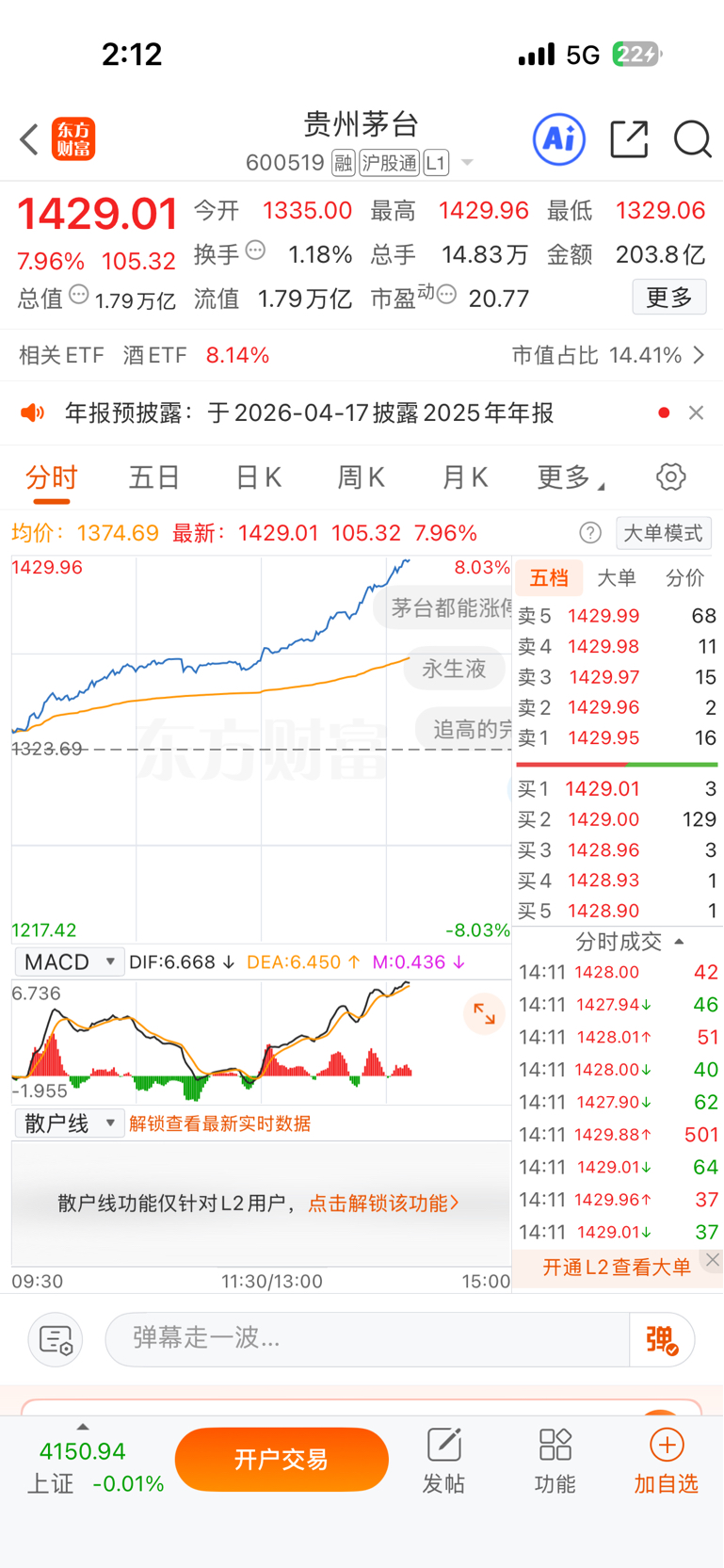 $格力电器(SZ000651)$ 茅台都快涨停了