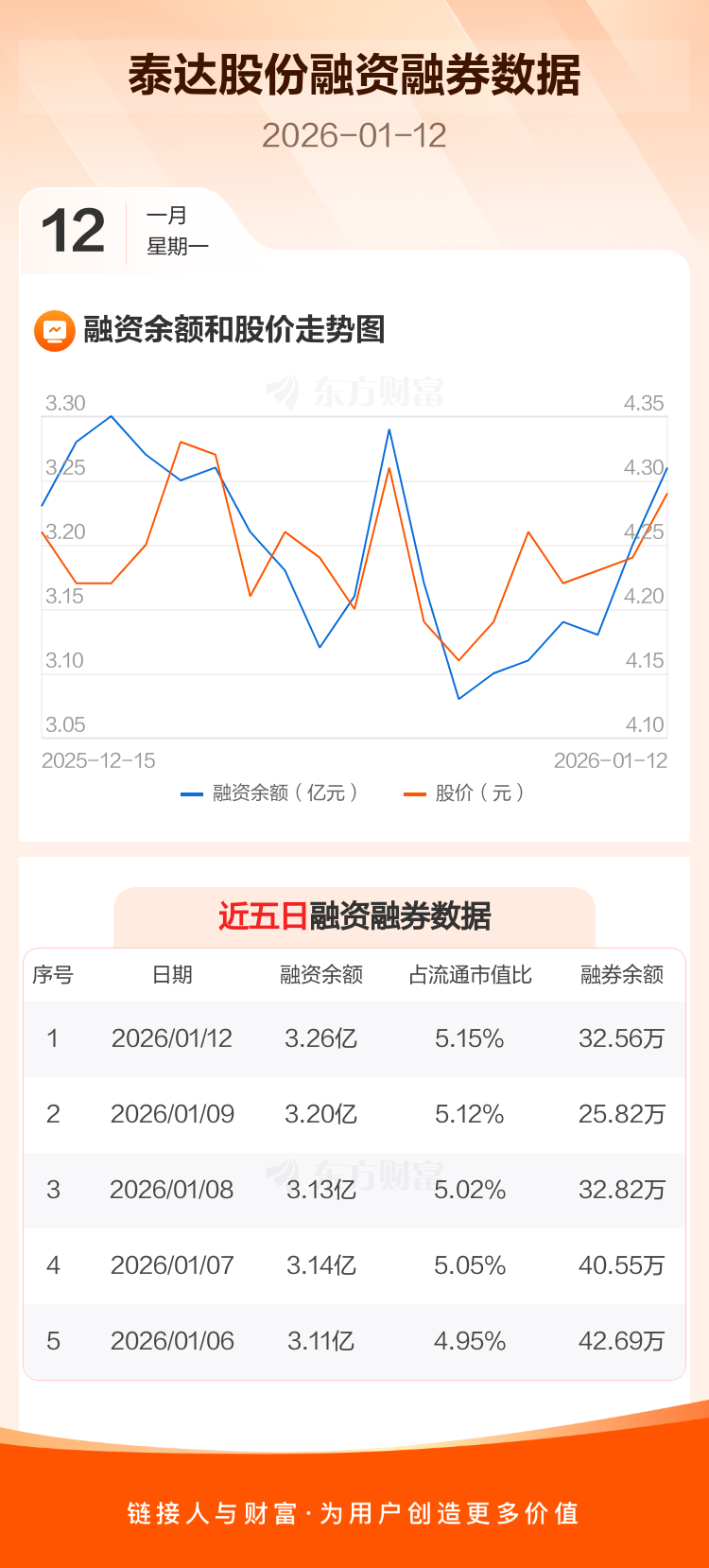交易所最新数据显示,泰达股份于2026年1月12日获融资买入2651.12万元,融资偿还2050.81万元,当日融资净买入600.3万元。目前,该股融资余额3.26亿,占流通市值比例为5.15%。
