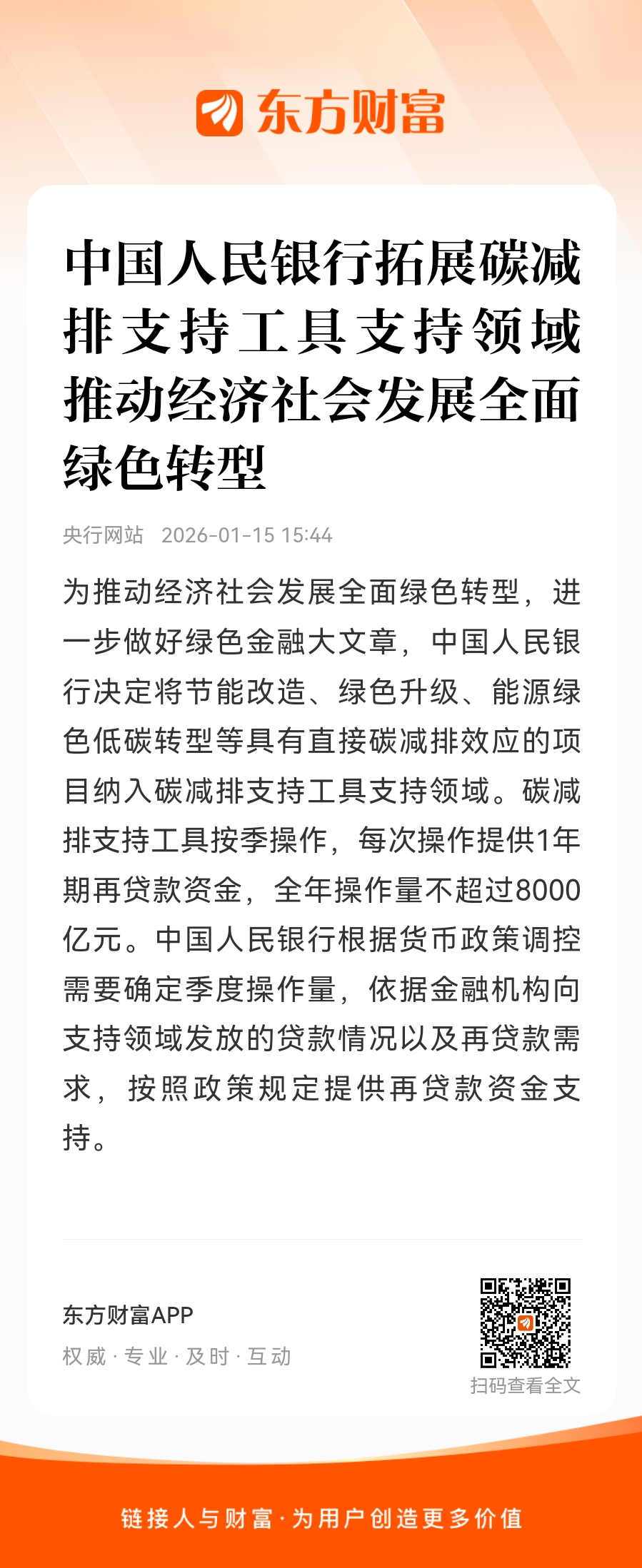 为推动经济社会发展全面绿色转型,进一步做好绿色金融大文章,中国人民银行决定将节能改造、绿色升级、能源绿色低碳转型等具有直接碳减排效应的项目纳入碳减排支持工具支持领域。碳减排支持工具按季操作,每次操作提供1年期再贷款资金,全年操作量不超过8000亿元。中国人民银行根据货币政策调控需要确定季度操作量,依据金融机构向支持领域发放的贷款情况以及再贷款需求,按照政策规定提供再贷款资金支持。