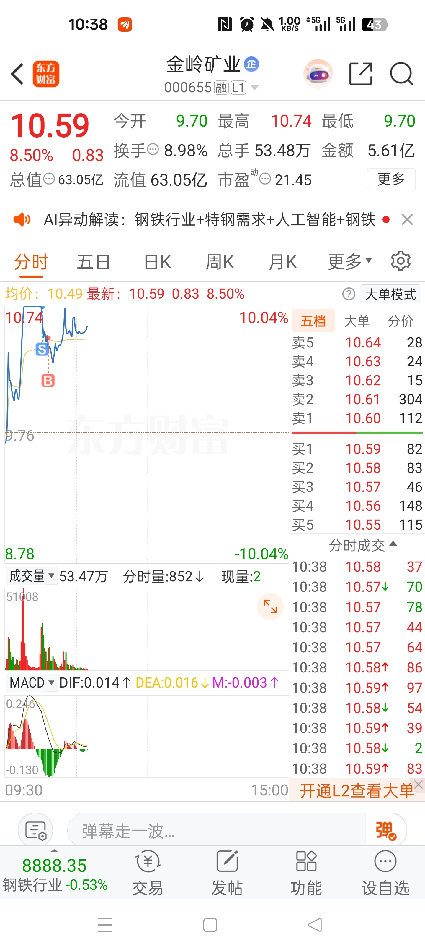 $金岭矿业(SZ000655)$ 涨停卖了,10.4又接回来了