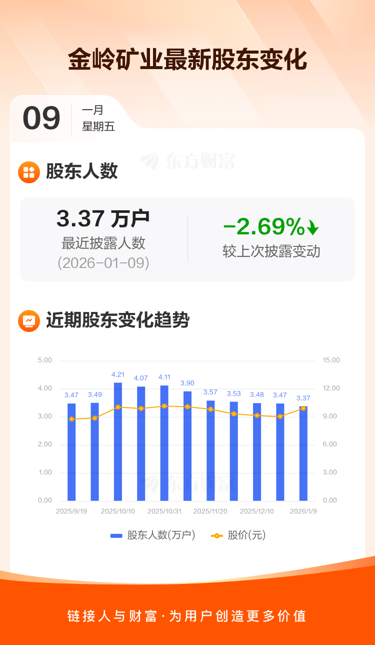 金岭矿业:截至1月9日最新股东户数3.37万户,较上期减少2.69%