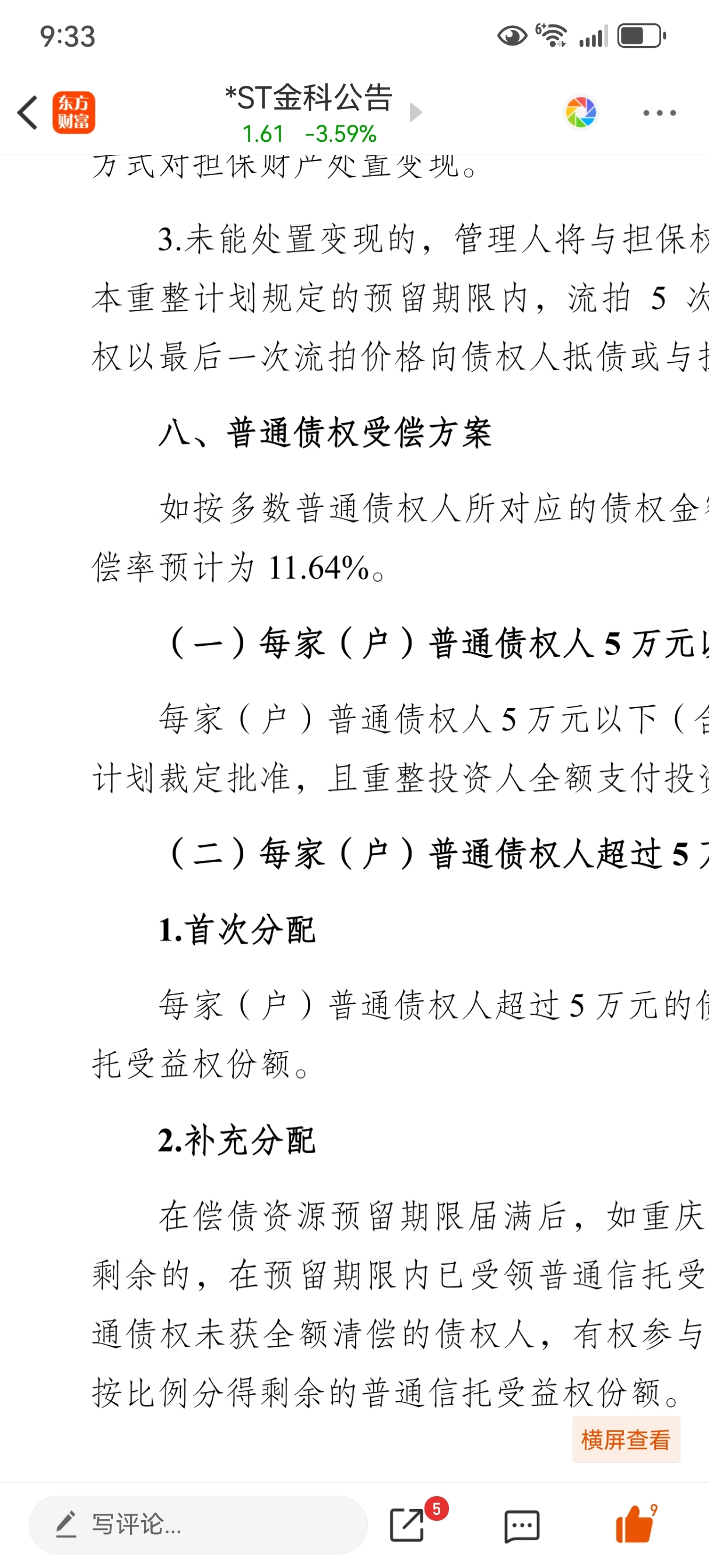 偿债率11.64,这下普通债权人该不会反对了吧,比清算多多了,还有金科重整后的工