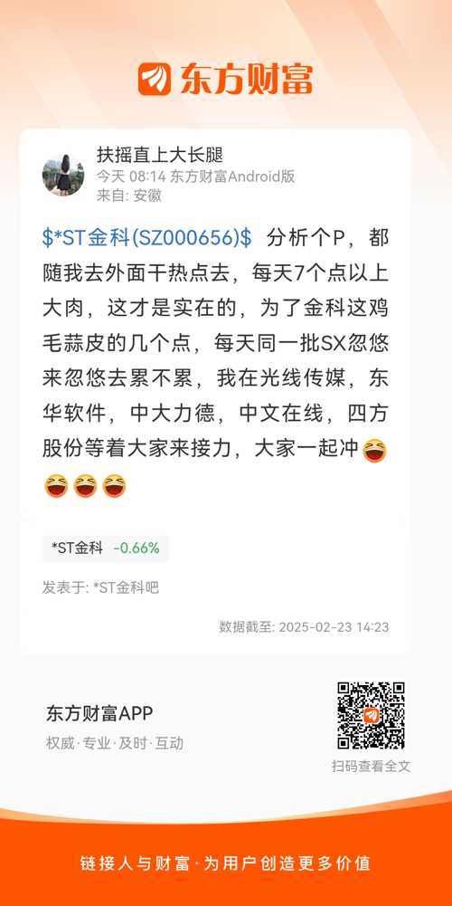 $*ST金科(SZ000656)$ 分析个P,都随我去外面干热点去,每天7个点以上大肉,这才是实在的,为了金科这鸡毛蒜皮的几个点,每天同一批SX忽悠来忽悠去累不累,我在光线传媒,东华软件,中大力德,中文在线,四方股份等着大家来接力,大家一起冲