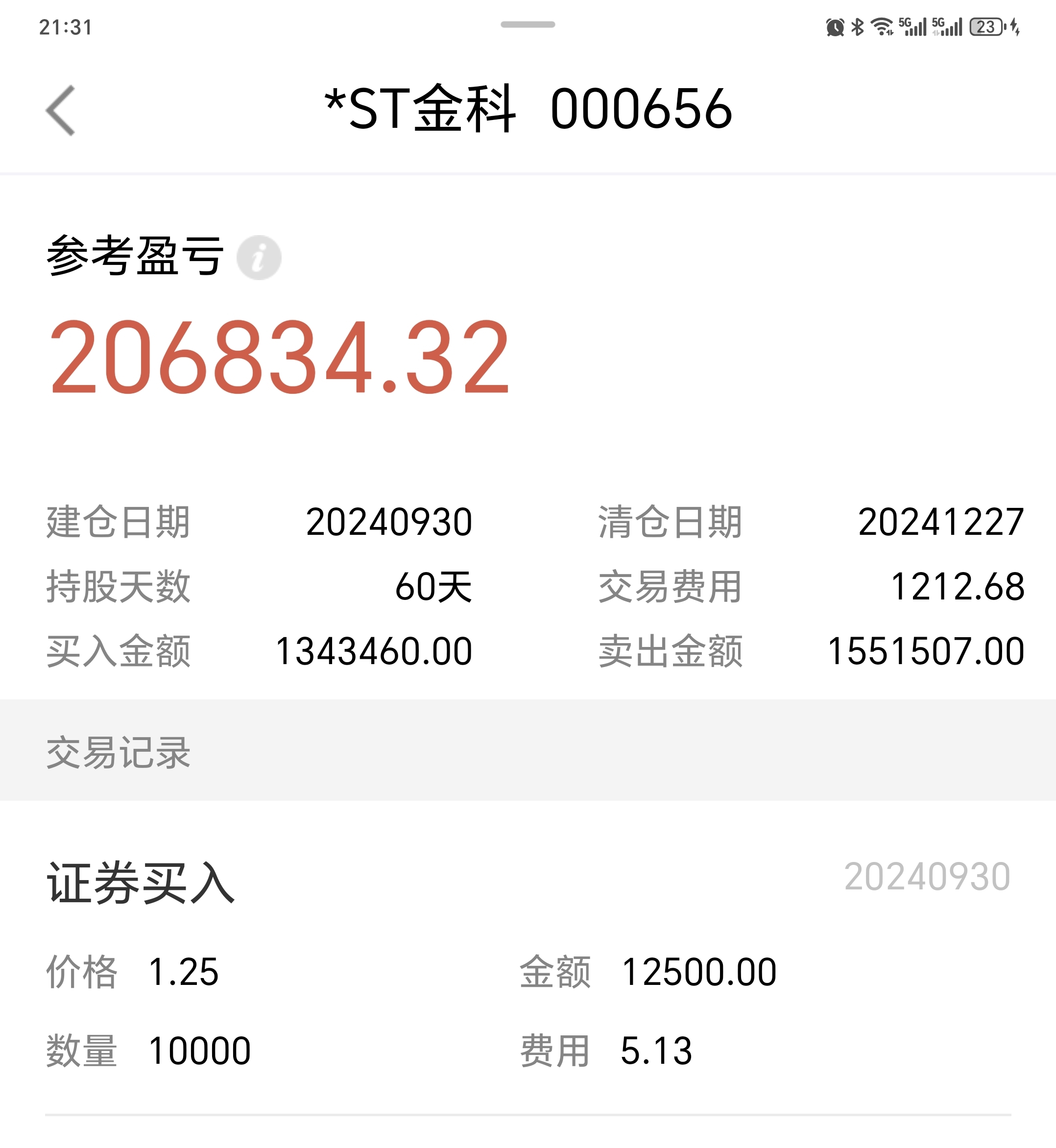$*ST金科(SZ000656)$ 发一个交易记录自证清白。2024年9月30日开始建仓,到12月26日知道重整方案,12月27日果断走人。在如此大的利空下,还抱有幻想的人,你们不亏钱谁亏钱。我估计又会有人说我想骗取筹码,我只能说你们的愚蠢突破了我的认知。