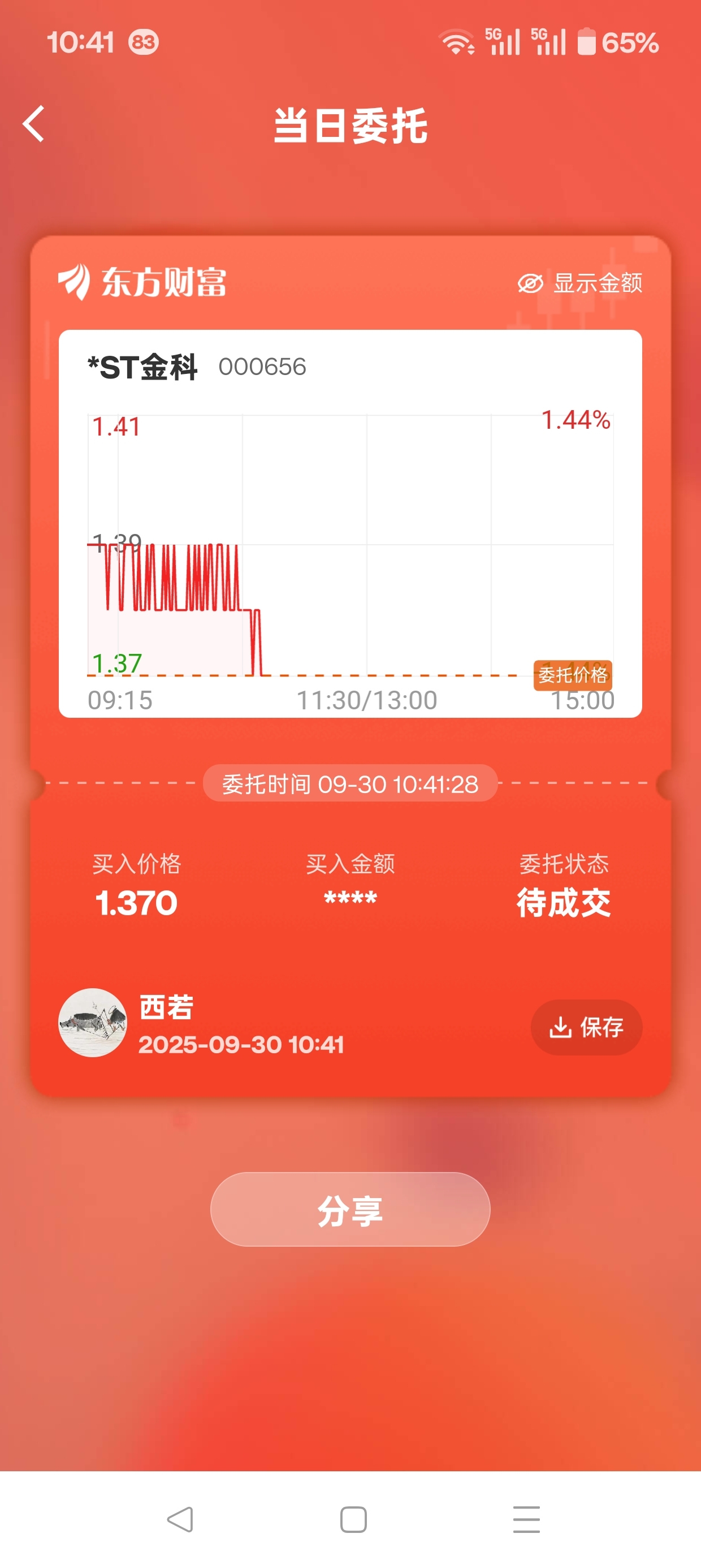 $*ST金科(SZ000656)$ 同志们,开始买入金科,1.36今天会涨摸一下,但是买不到。节后跌穿1.36
