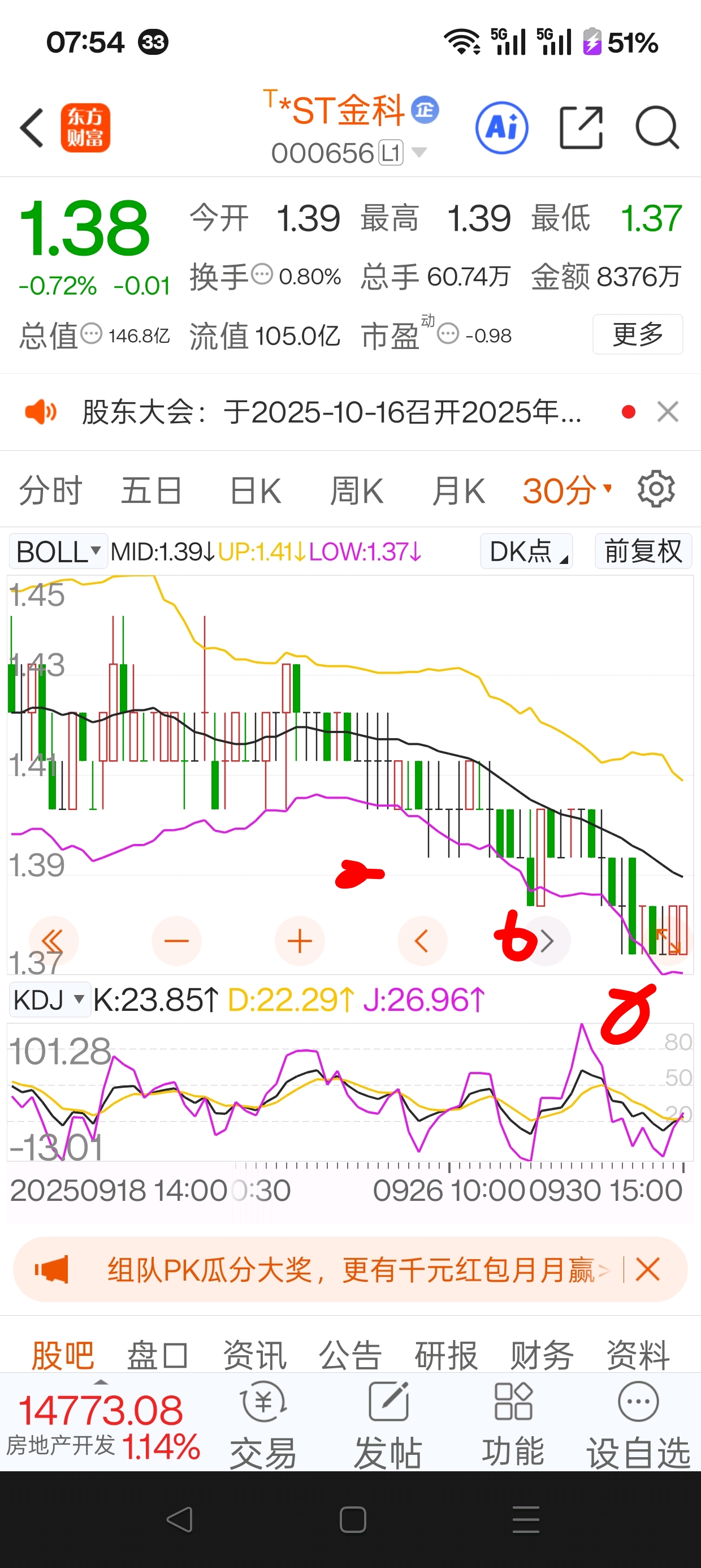 $*ST金科(SZ000656)$ 半小时线,股价葱上轨线出下来,第三次触及下轨线,那就是买入信号。
