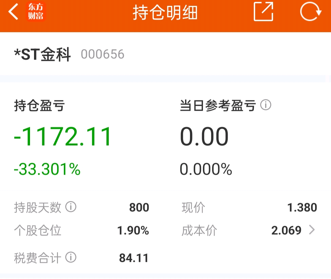 ST金科我持股800天,每天都在亏,亏了33个点了,每次跌都有加仓,还是跌。还没