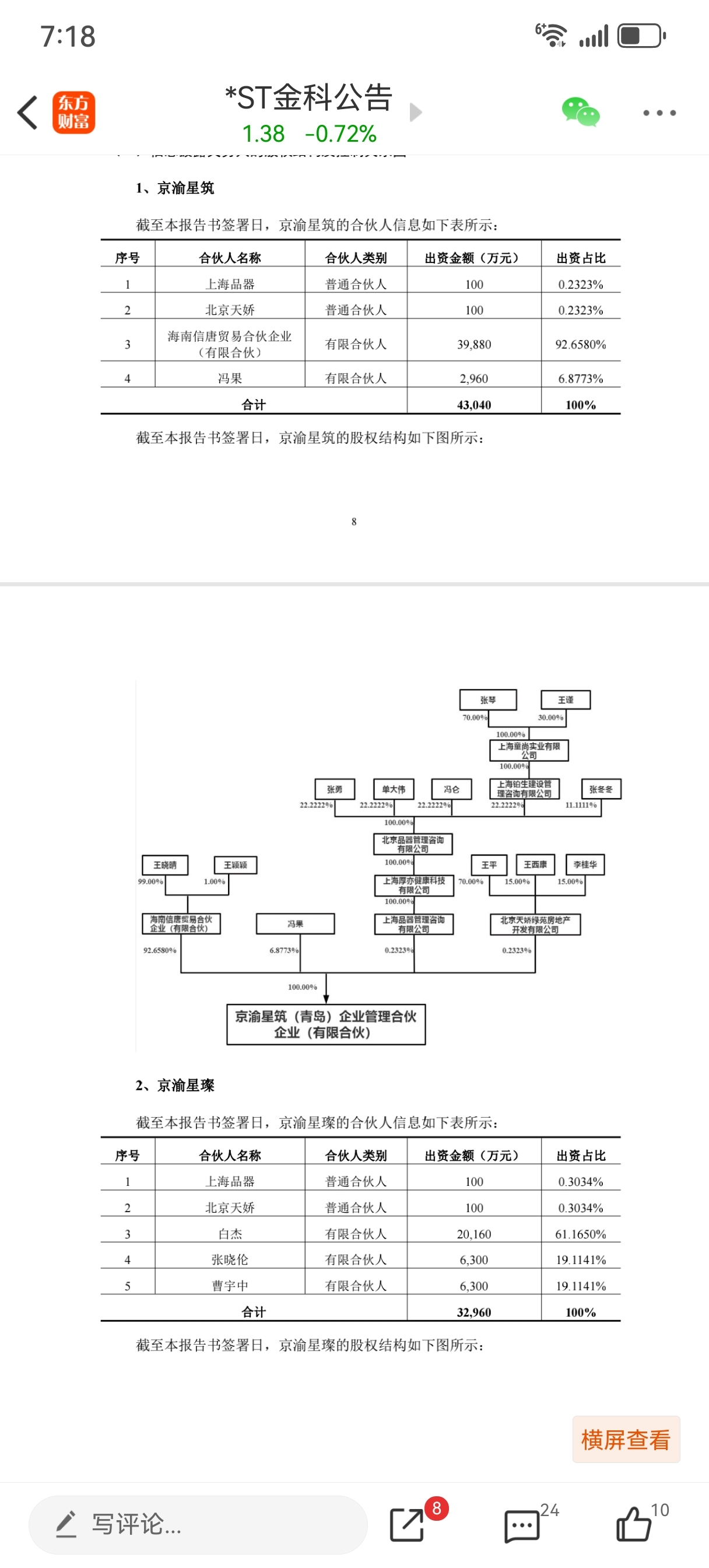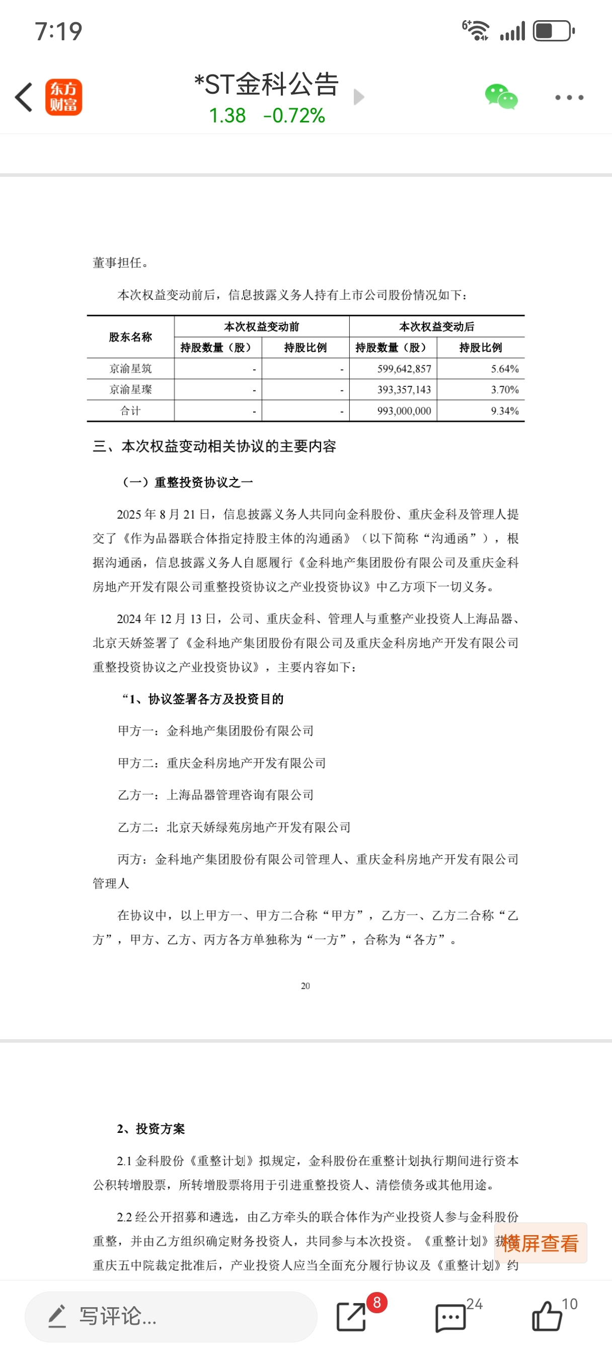$*ST金科(SZ000656)$ 金科已经变国有控股了,银原不增持完也是为了稳固国有的地位,看一下股东构成就清楚了,四川国资和长城已经占了不少股份,而品器又把股票分给了两个股东,京渝星筑又占了大头,而京渝星筑大股东是海南信唐92%,海南信唐变相持股就压制了京渝星璨3.7%,海南信唐王晓晴占99%,再看看他的身份,四川人大常委,退役军人委员会副主席,本质上就是政府那边的,所以整个重整其实一直都是政府在主导,品器只不过是起了一个穿针引线的作用,再看财务投资人,多数也有政府背景,老黄已经一去不复返了,金科已经进入国资控股时代,而目前谁才是房地产最大的资源持有人,当然是政府,政府控股金科本质上也是肥水不流外人田,对金科也是好事,相当于一个农民工突然变成了公务员,资源这一块就非比寻常了。债权人之所以同意金科重整,也正是有政府的背书,否则谁会相信品器这样一个壳子和黄红云。