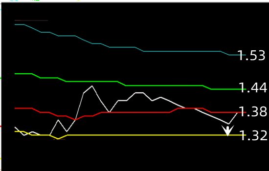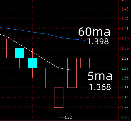 现价线描写的是收盘价点,实际上周一盘中已经回踩底部线1.32,周二周三上拐,本周有望站上1.40.