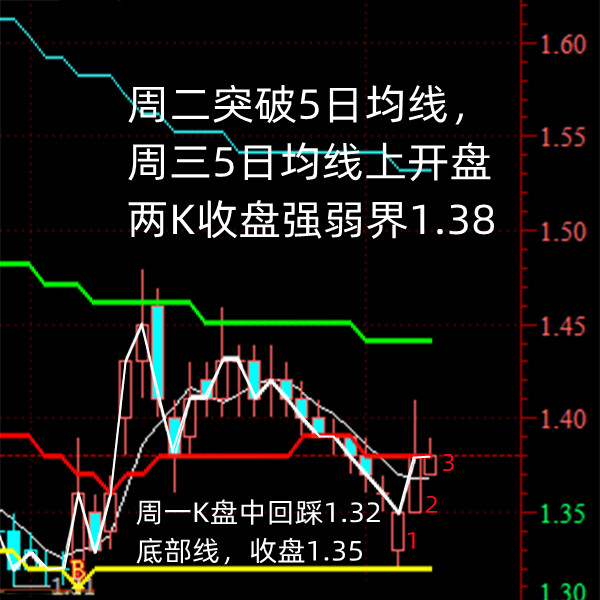 本周一盘中已经回踩技术底1.32,现价在1.38与强弱界同步,上穿强弱界买入信号