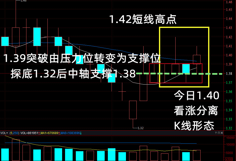 技术含义仅仅作为分析参考,客观上是资金运作的结果,往下是否持续未知。明日稳住1.40或者突破,那就看向短线最近的高点1.42,可以放大至1.44,中短线高点1.46,但目前看概率较低。