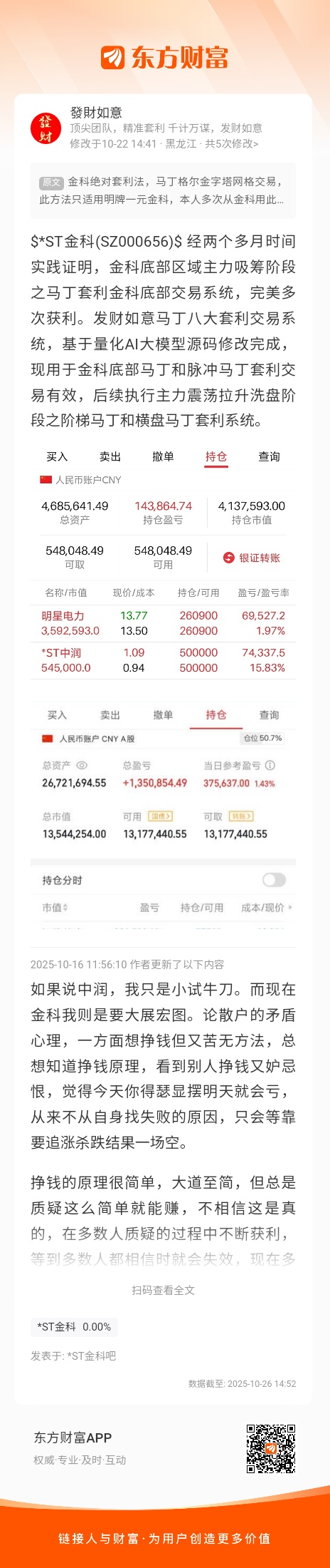 //@发财如意 :$*ST金科(SZ000656)$马丁战法套利金科,这几个月效果还是不错的,任何战法都有时效性,不同阶段用不同战法,不少投机达人都有战法,例如徐翔的一字断魂刀...实事求是的说,这是人家的武功绝学,别人去学不一定会用的好。