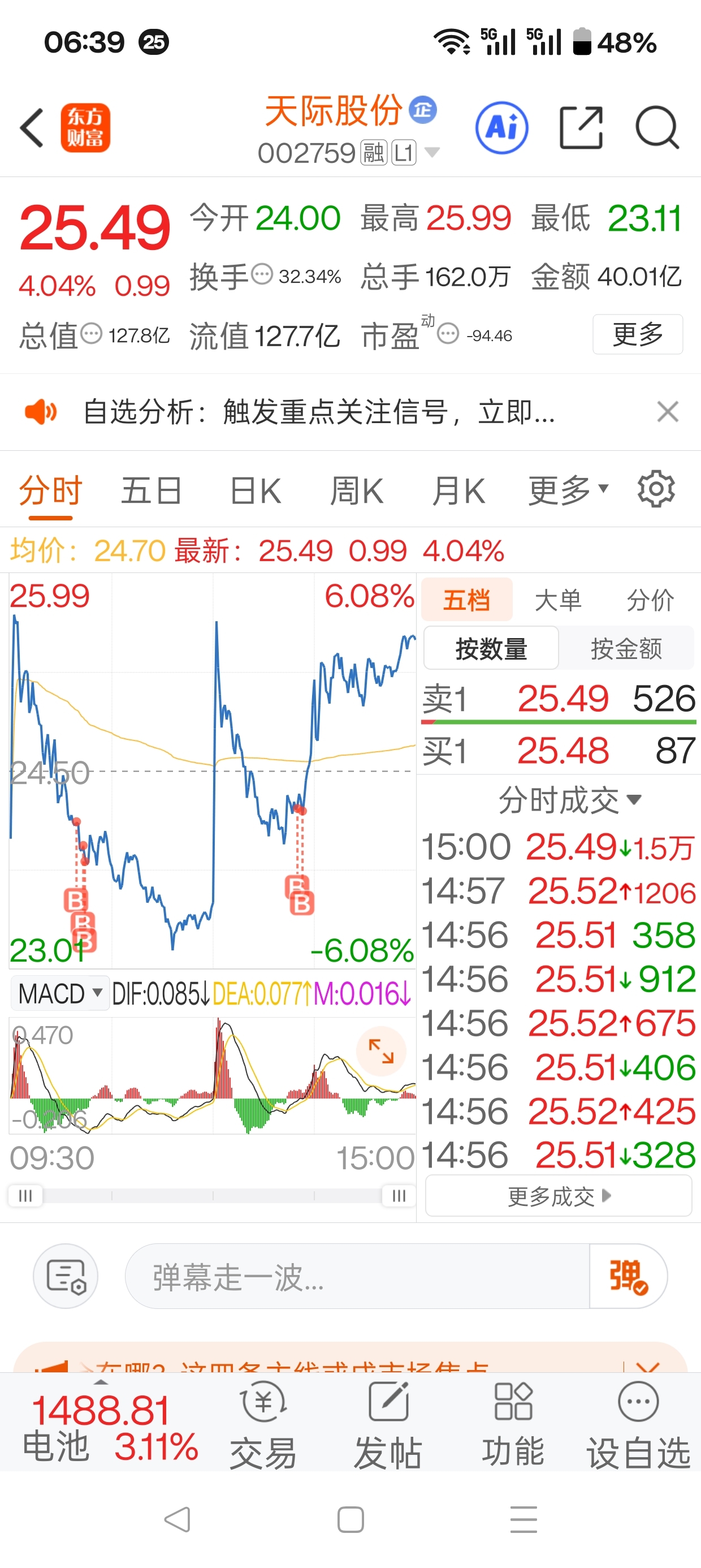 $*ST金科(SZ000656)$ 金科,目前没有投机价值,但是投机价值已经慢慢走来了。只有涨到1.50的时候,才有买卖得价值。几个月做一毛钱差价,只有坚持天天做差价才行。我说的是按照全仓比例说的。每天做一分钱差价只能半仓或者四分之一仓位,也得一个月。做个示范,天际股份,周二涨了百分之七,周三你才可以去买。