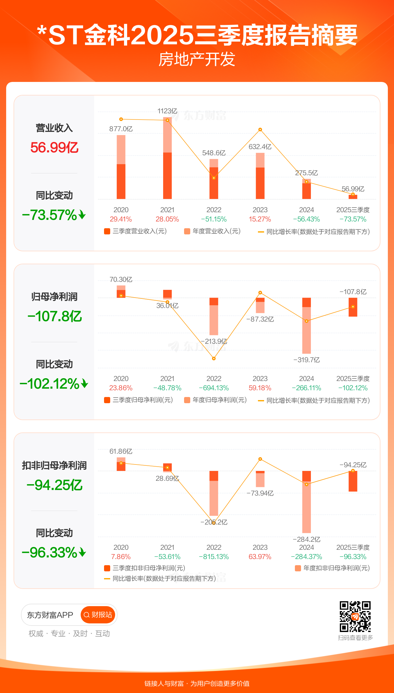 *ST金科10月31日发布2025年三季报显示,公司前三季实现营业收入56.99亿元,同比下滑73.57%;归母净利润-107.78亿元;扣非归母净利润-94.25亿元。