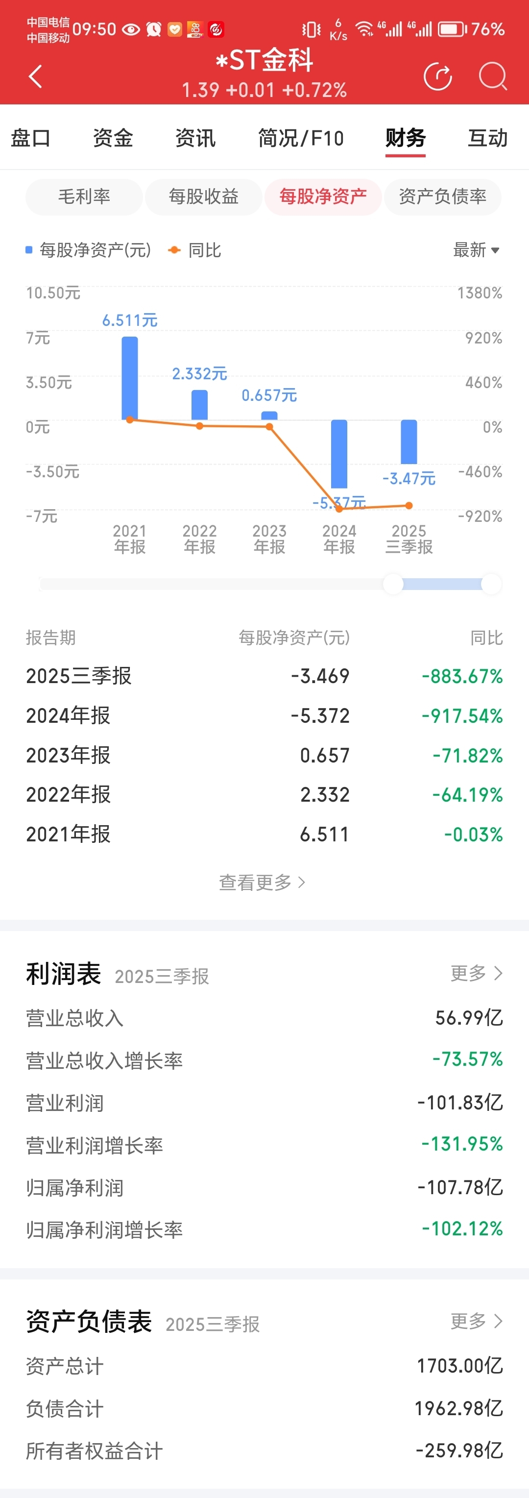 $*ST金科(SZ000656)$ 不知道你们看好什么,炒股超预期,都是提前涨,不涨就没希望了全是散户,重组基本结束,净资产还是负的,你要它怎么涨,摘帽都做不到。