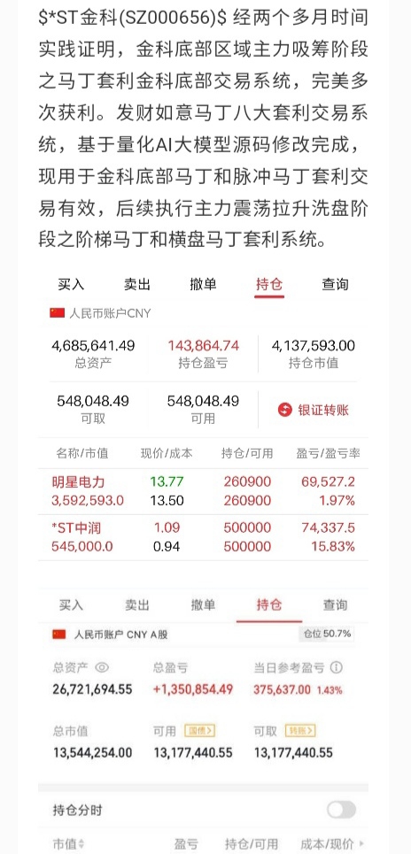 $*ST金科(SZ000656)$ 终于被放出来了,话不多说了,经过前期底部吸筹套利后,发财如意八大套利交易系统,进入第二阶段交易套利,执行主力震荡拉升洗盘阶段之阶梯马丁和横盘马丁套利系统。每个人都有每个人的交易习惯,每个人都有每个人的长处与短处,适合自己的才是最好的,如何发财如意,唯有提前布局。