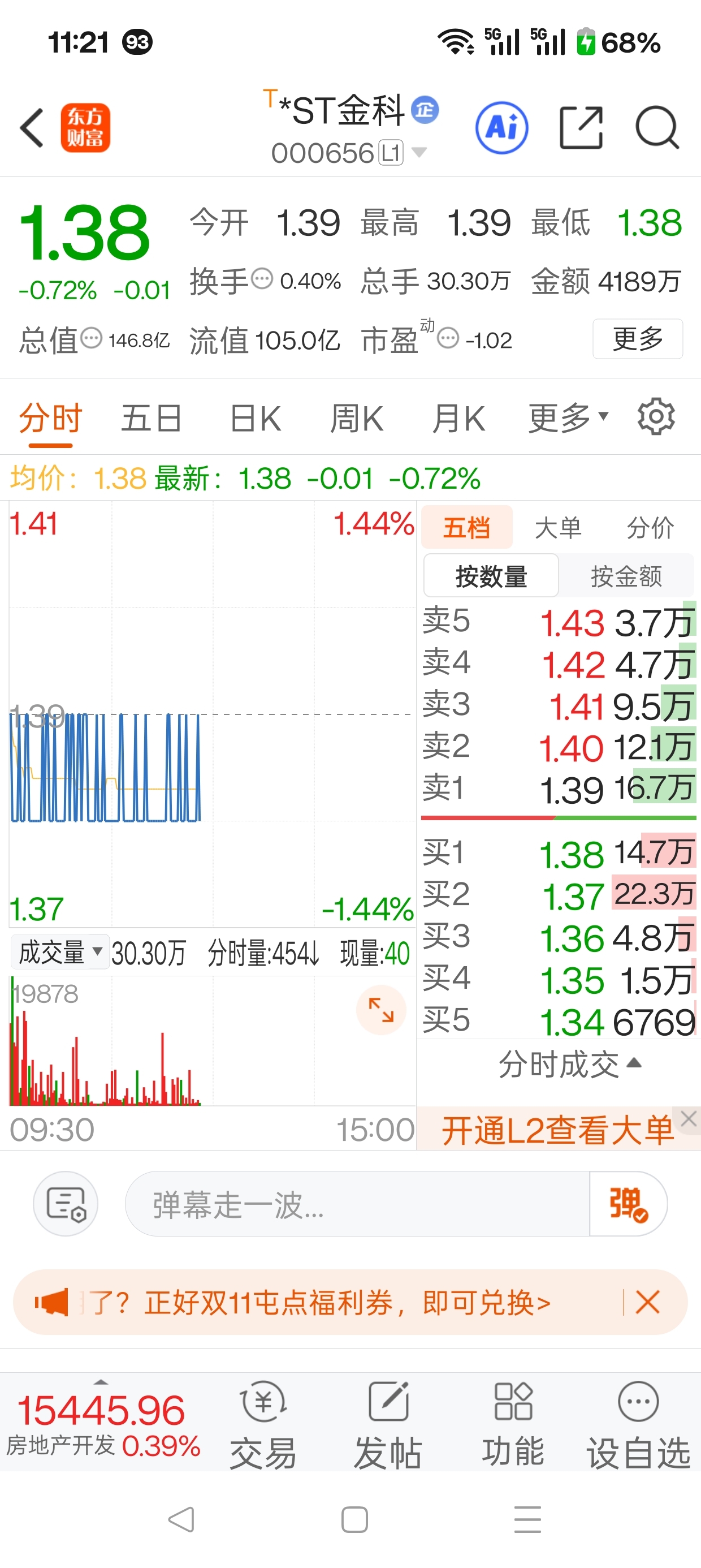 $*ST金科(SZ000656)$ 还马丁战法呢,1.38买1.39卖,你试试看呢?庄家不给你机会的。
