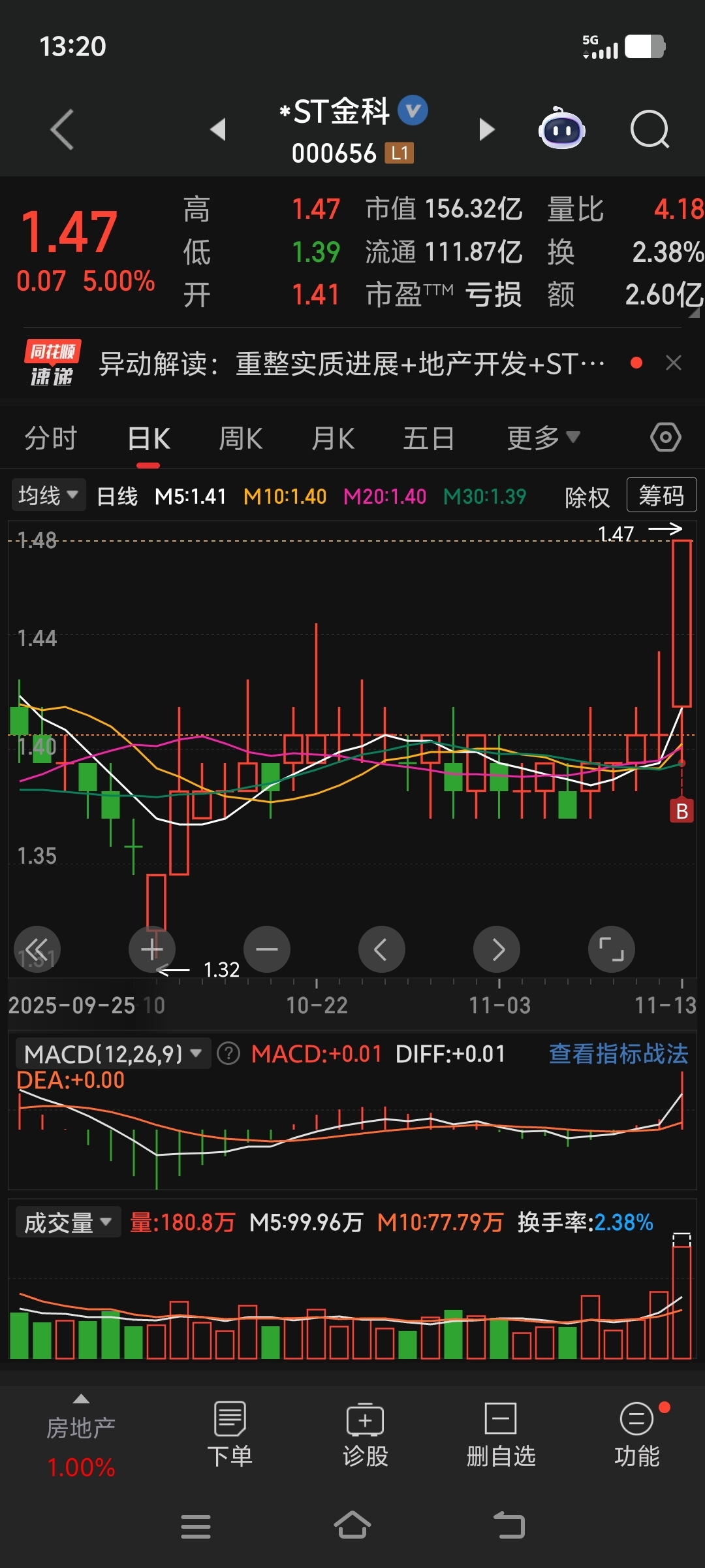 $*ST金科(SZ000656)$ 来得早不如来得巧,看得出来,这个股潜伏很久的时间的人多的很。