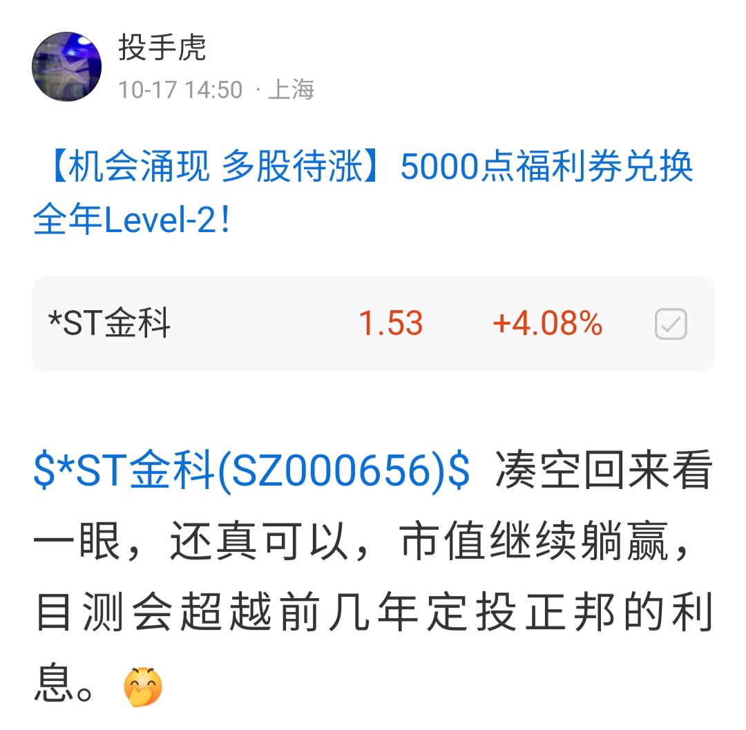 $*ST金科(SZ000656)$ 从时间上看,已大大超越定投正邦的收益哦,不费时,不费力,躺赢哦。