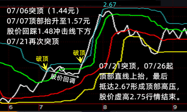 事实上0.77之后,股价在活跃区N字震荡,最后一笔大斜度直接上穿冲击线和顶部线,然后回调蓄势,然后721行情爆发。
