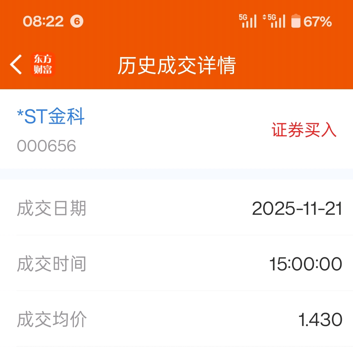 $*ST金科(SZ000656)$ 上周五参与尾市集合竞价买入金科,1.43挂单,指望收盘1.42,投机一把。莫有成功,买在了1.43。所以说,马丁战法不适合金科,只能玩一剑封喉战法。