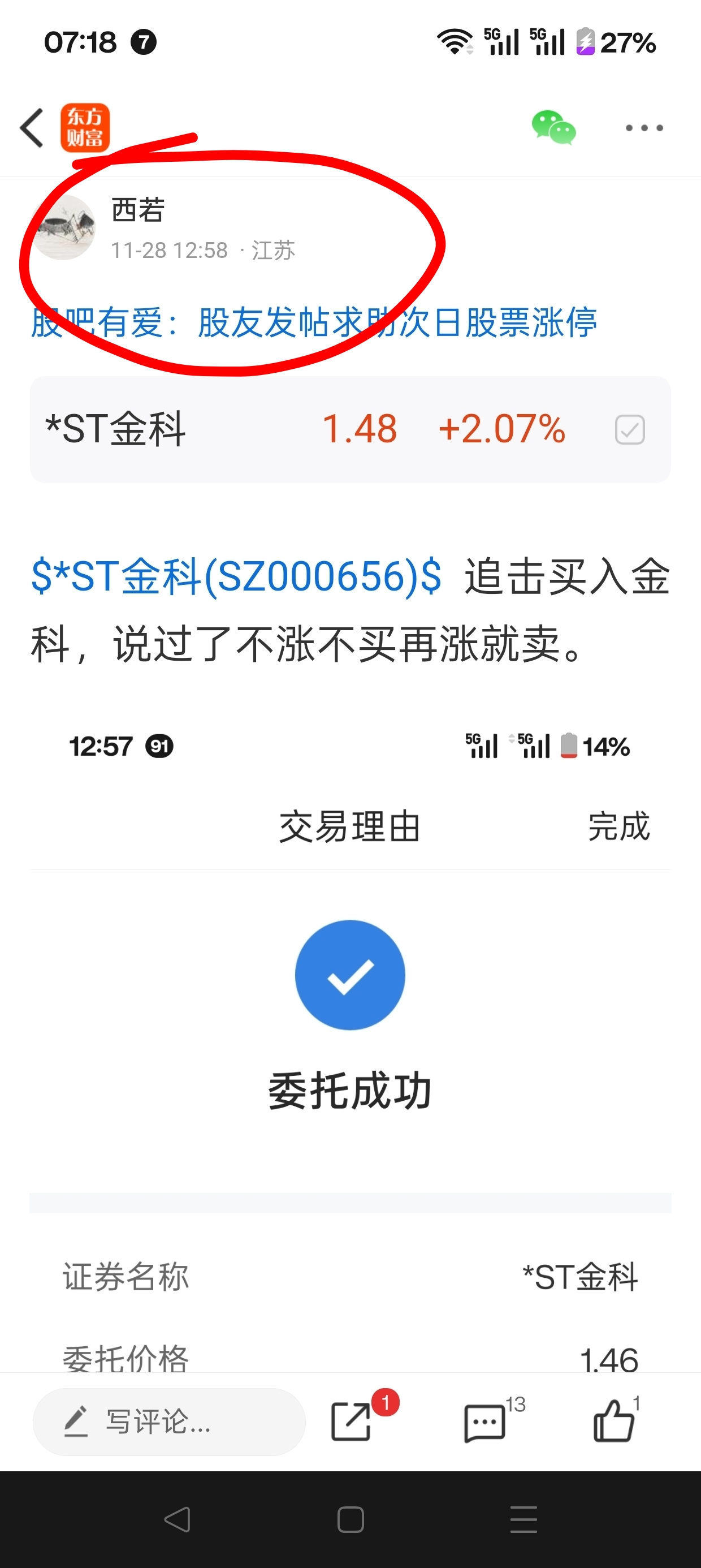 $*ST金科(SZ000656)$ 早就跟您们说过,马丁战法不适合金科买入。金科是炒题材的,属于消息股,利好预期消息来了,连续大涨,利空消息来了连续大跌。没有消息那就是阴跌,看盘面涨了,那利好就要来了,一把梭哈哦。消息兑现立马走人。那么,马丁战法不好了吗?也不是。我一直跟大家说。马丁战法适用成长股绩优股,比如。我跟大家多次说过的德龙汇能,一个月前,你告诉你就用马丁战法开买,越跌越买,你看看,到今天一把清空。然后。重新马丁战法买起,越跌越买。所以,大家不要学股吧里的那几个人,自己钱不够,还要去租借银子炒,自己的钱都玩的高高的套在上面,靠几个借来的钱买金科,你说丢人不?还不如集中好自己的钱,等好了机会来个一剑封喉呢。估计,那几个人,自己的钱多数都套在金科高处,这是何必呢。周五下午开盘前,紧急提示大家买入1.46,结果没人听,还把注意力都集中在买卖数量上。。如果你买了1.46,半小时内,你可以轻松1.50卖出,四分钱差价就有了,是不是顶你一周做的差价?。机会稍纵即逝啊。