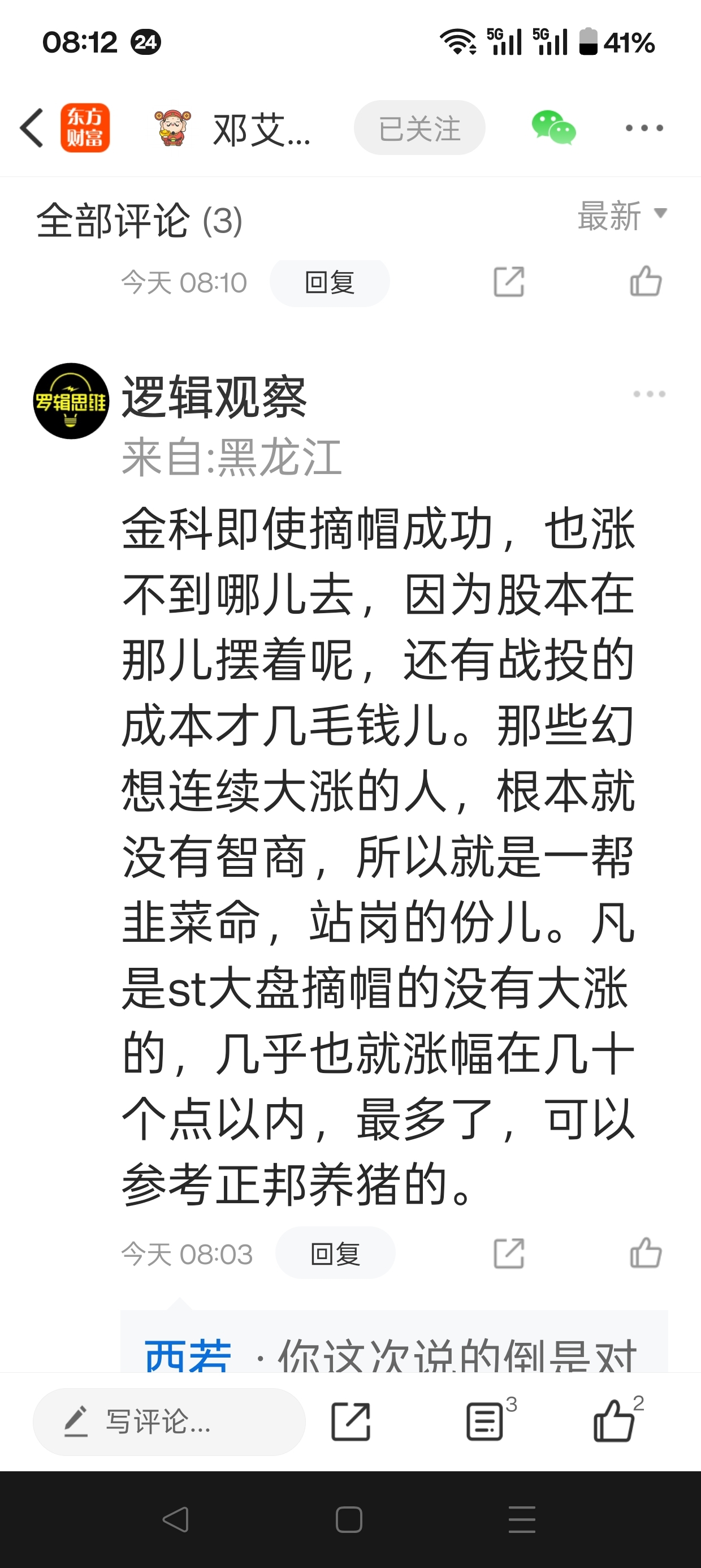 $*ST金科(SZ000656)$ 平时说金科很不靠谱的人,也有说的很正确的时候。所以不能低估任何一个人的潜力。金科,确实不可能连续大涨,毕竟亏损太多,房地产又在走下坡路。所以。他说幻想连续大涨的人,就是没智商得人。说的一点没错。
