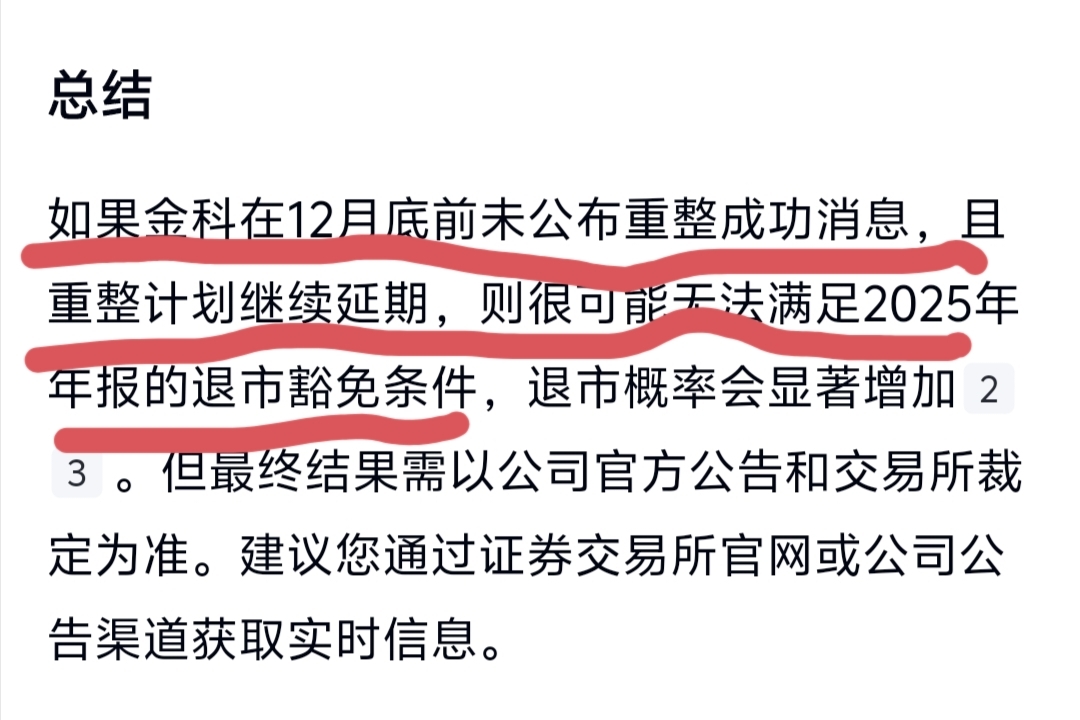 $*ST金科(SZ000656)$ 如果公司董秘刁钻,非要在31号晚上最后时刻公布重整成功,但问题就来了,因为我们不知道最后时刻到底能不能出公告,31号收盘之前到底卖还是不卖?如果没有消息,就像发射火箭一样,时间窗口就错过了,上市公司地位不保。当然,如果有公布消息,那后面肯定就是1万个涨停板。