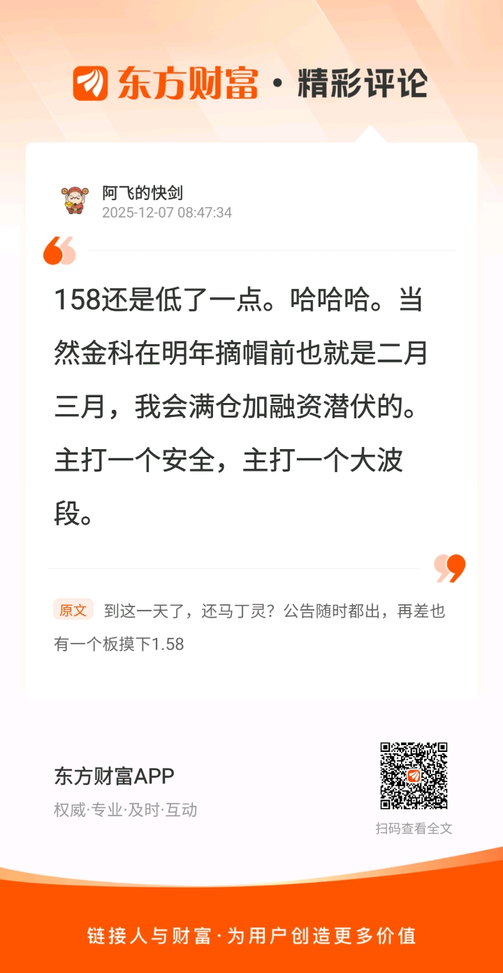 玩金科,阿飞是我看到的敢于嗮单的一等一的高手。当年安徽的秀才,金科一战封神,成为传奇。接下来就看我的啦//@阿飞的快剑 :158还是低了一点。哈哈哈。当然金科在明年摘帽前也就是二月三月,我会满仓加融资潜伏的。主打一个安全,主打一个大波段。