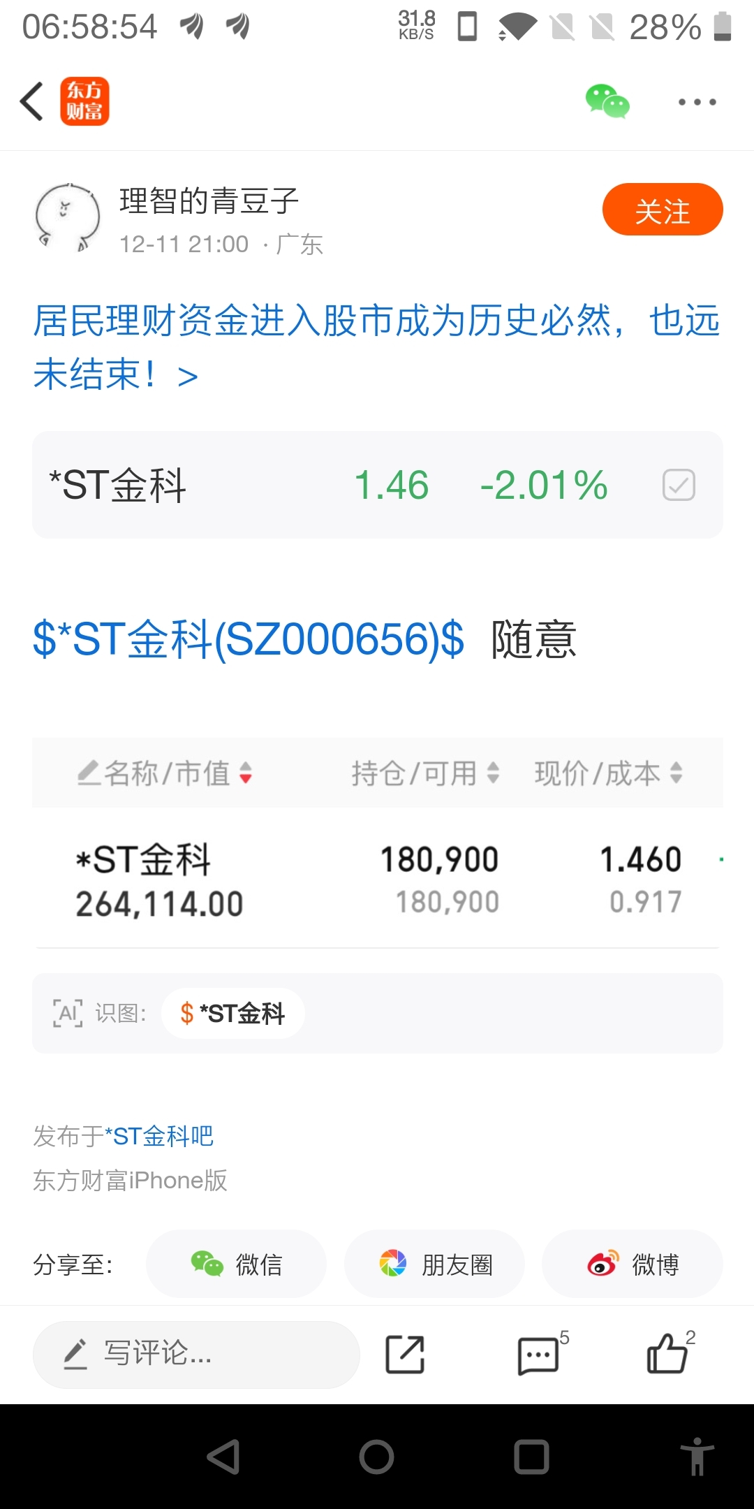 $*ST金科(SZ000656)$ 炒股买卖参考价不是你的成本。我都是把成本修订到我的目标价,一旦账面翻红,必须清仓重来。你却把成本修改到低位,看上去确实好看。