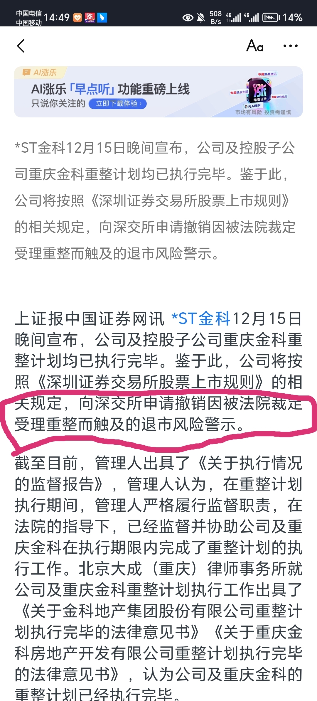 $*ST金科(SZ000656)$ 没什么高兴的,重组完毕,净资产还是为负,所以只是撤星,照样带帽。看看重点。