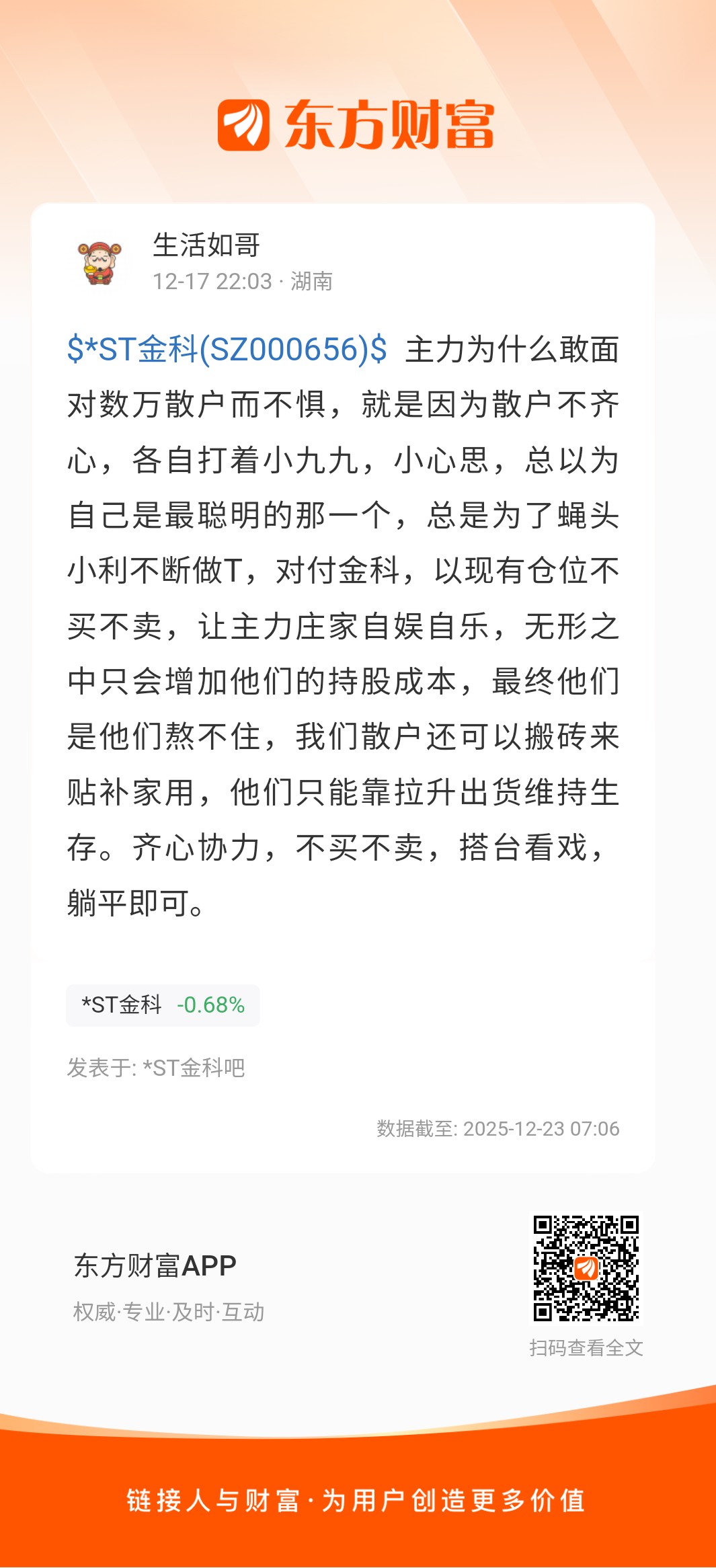 $*ST金科(SZ000656)$ 主力为什么敢面对数万散户而不惧,就是因为散户不齐心,各自打着小九九,小心思,总以为自己是最聪明的那一个,总是为了蝇头小利不断做T,对付金科,以现有仓位不买不卖,让主力庄家自娱自乐,无形之中只会增加他们的持股成本,最终他们是他们熬不住,我们散户还可以搬砖来贴补家用,他们只能靠拉升出货维持生存。齐心协力,不买不卖,搭台看戏,躺平即可。