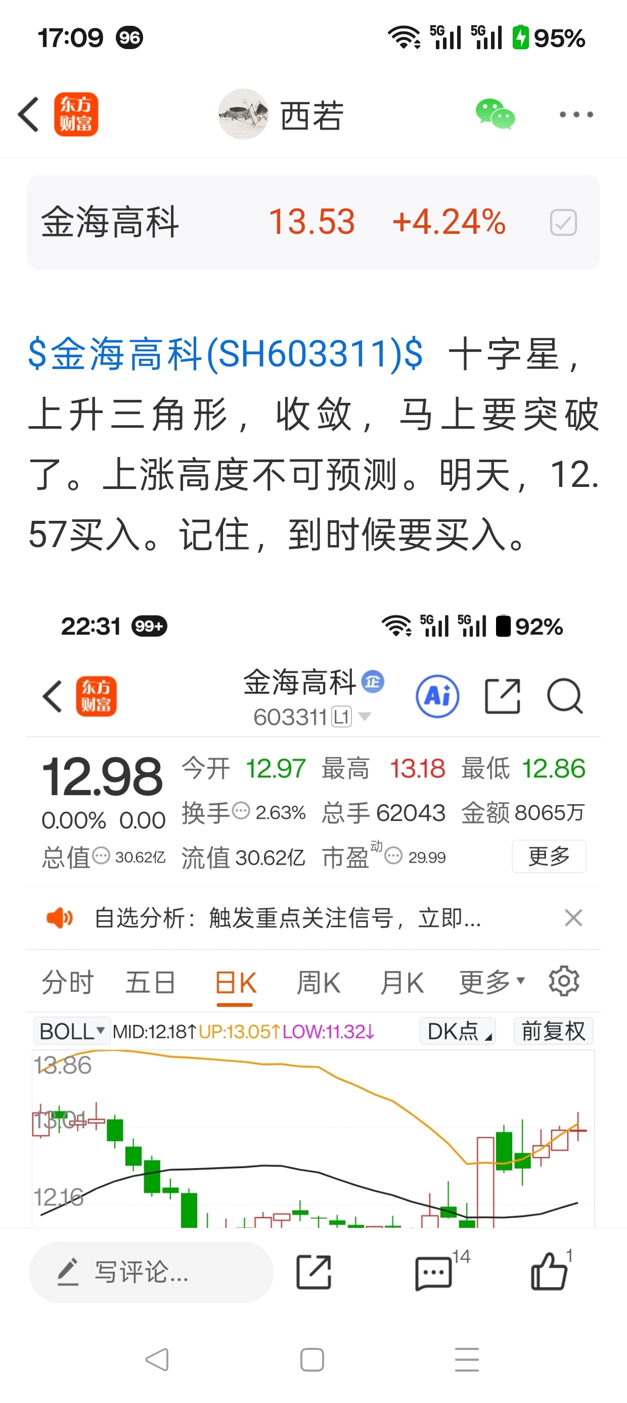 $*ST金科(SZ000656)$ 昨天推荐的时候股价还在12.98,今天,靠,到了13.53了。