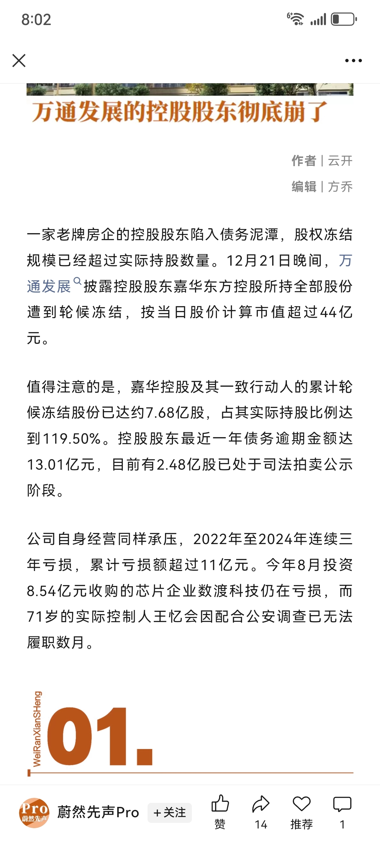 $*ST金科(SZ000656)$ 万通的大股东股权要法拍了,金科老黄的会不会也被动处置,若真如此,那主力压盘的目的就在这里了,但是老黄的股权要是真被处置,金科股东要是有人来买,很可能就是金科最大股东了。这就是控制权的问题了。总之,金科的未来还是扑朔迷尼。