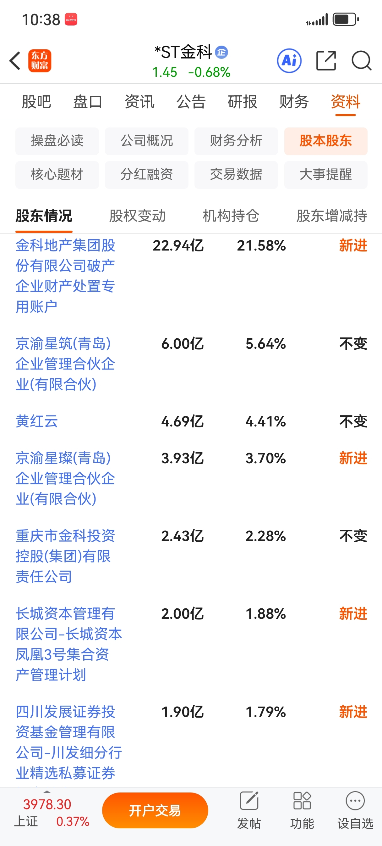 $*ST金科(SZ000656)$ 黄红云和金科控股持股比例加起来6.9%,京渝星筑是5.64%,股价低位,只可能让黄红云和金科控股质押爆仓,对其他股东没有影响。重整人想彻底控股金科以绝后患,只能让老黄的股份被动处置,否则,重整人是睡不安稳的。明年九月财投和很多债权人的股份一旦抛出,老黄要是购入股票,到时候金科很可能又是老黄说了算。金科的新旧势力之争,还是没有结束。为了股权争夺处于有利地位,重整人压股价是完全有可能有动机的。