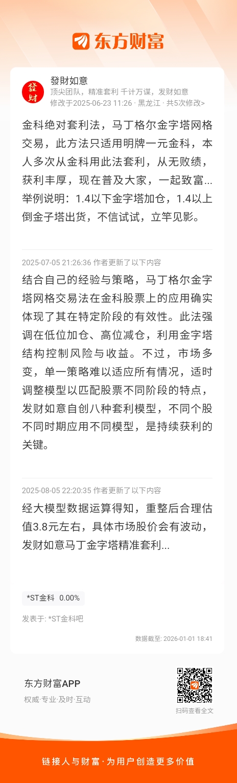 金科绝对套利法,马丁格尔金字塔网格交易,此方法只适用明牌一元金科,本人多次从金科用此法套利,从无败绩,获利丰厚,现在普及大家,一起致富...举例说明:1.4以下金字塔加仓,1.4以上倒金子塔出货,不信试试,立竿见影。