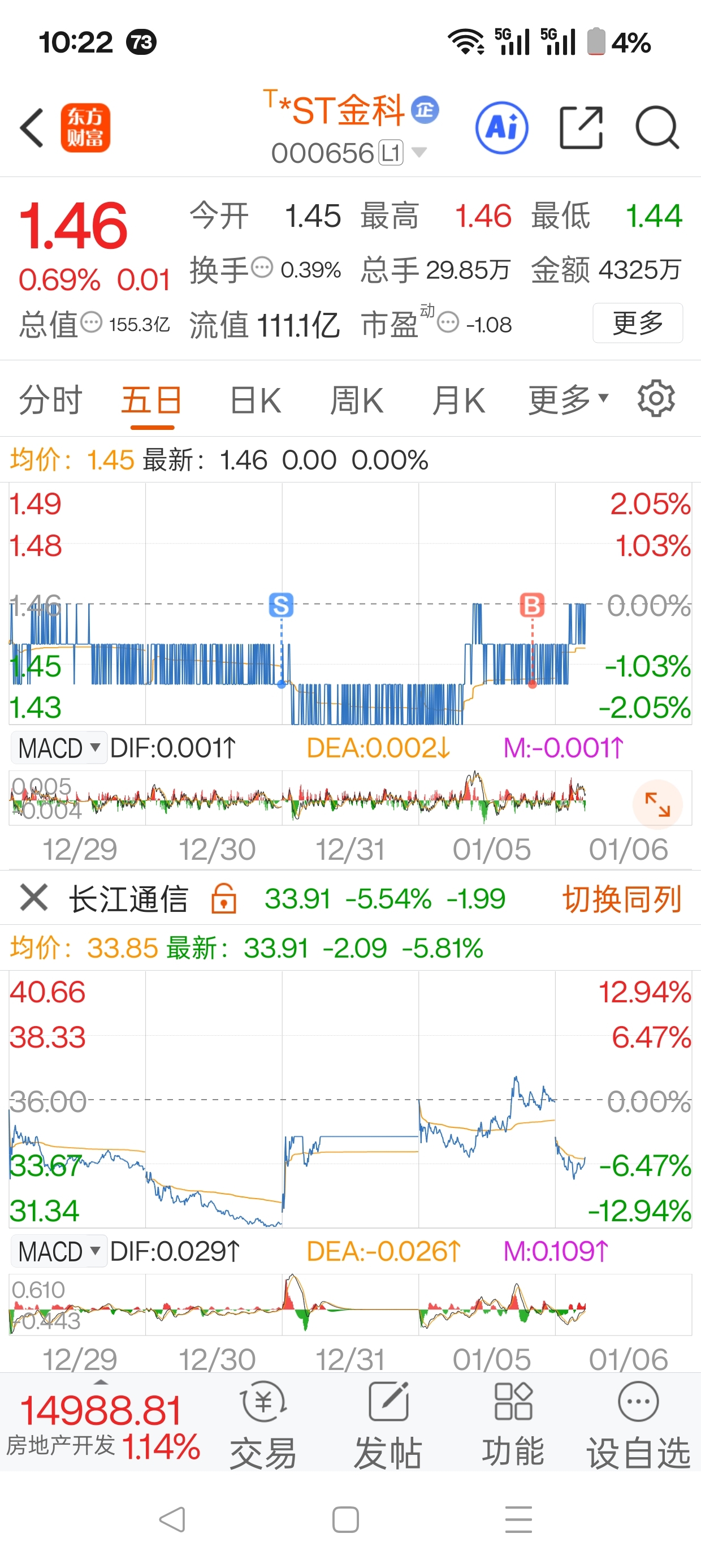 $*ST金科(SZ000656)$ 1.44卖出,1.44买入,中间去长江通信涨停股玩一圈。金科?钱没赚到,股数增加了。