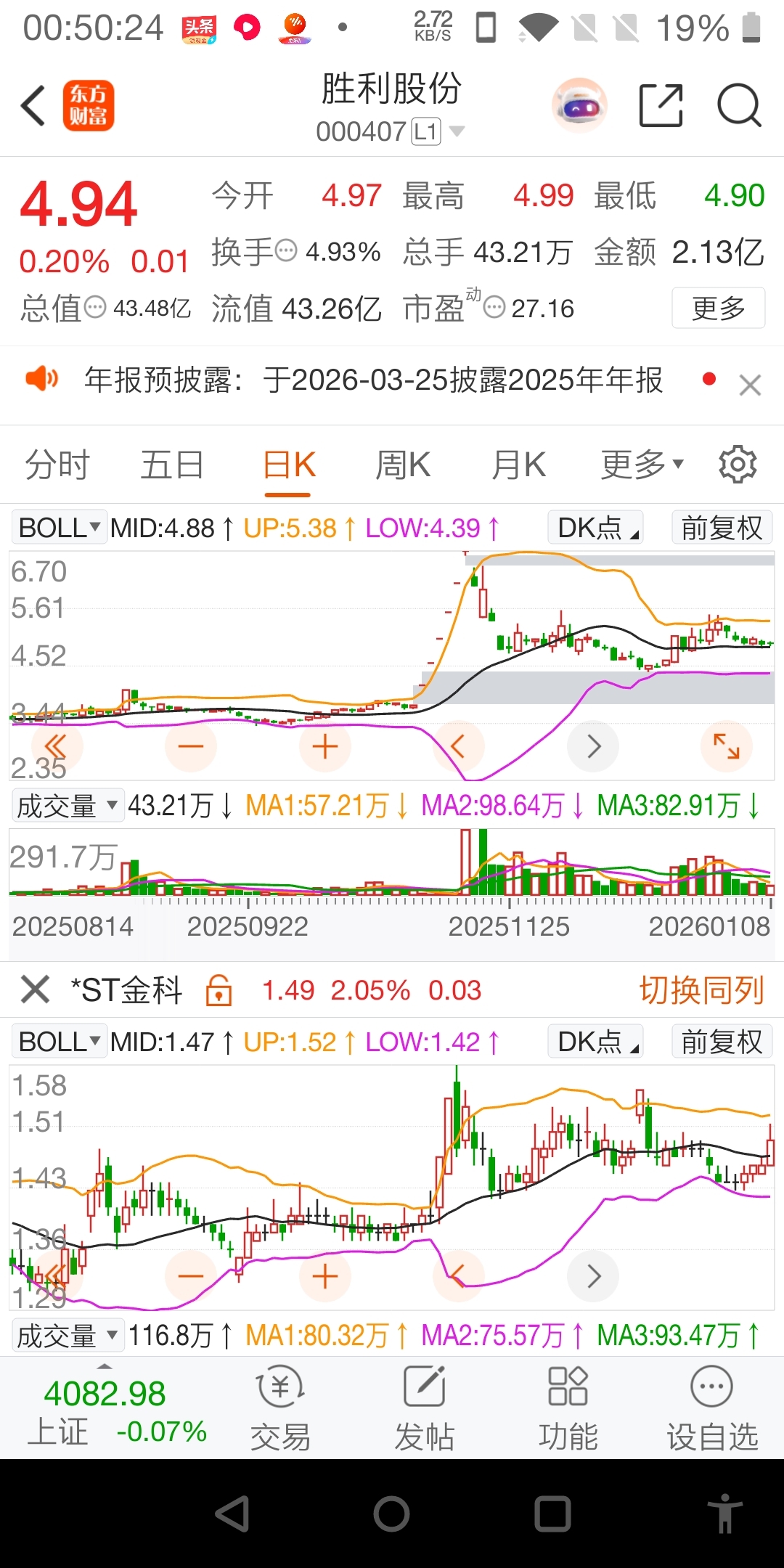 $*ST金科(SZ000656)$ 金科和这个股,有明显的相似度,题材完全不一样。来回切换不是很好吗?具体说,卖出金科1.49买入胜利4.94。半仓操作,明天收盘哪个涨的多就卖哪一个买另一个。