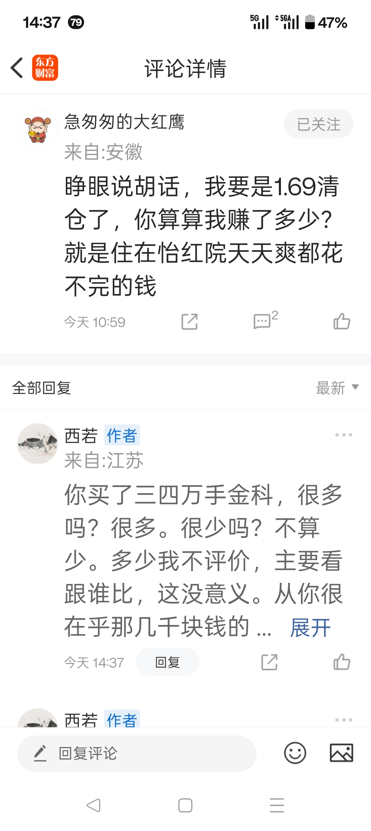 $*ST金科(SZ000656)$ 看到一个回帖,很有意思。说金科里赚到的钱,去yigong院都花不完。哈哈,只能说,你去的这个yigong院,档次不太高啊。是舍不得花钱还是咋的?赚不到那么多钱呢?还是不会炒股?哈哈哈,挺幽默的,这人。