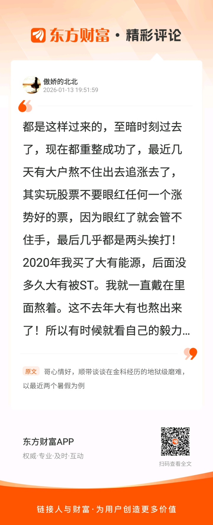 这段说的很经典,是这个意思。大牛市一个月没开张了,但本月只要开一次张就够了,投资收益就很满意了。//@傲娇的北北 :都是这样过来的,至暗时刻过去了,现在都重整成功了,最近几天有大户熬不住出去追涨去了,其实玩股票不要眼红任何一个涨势好的票,因为眼红了就会管不住手,最后几乎都是两头挨打!2020年我买了大有能源,后面没多久大有被ST。我就一直戴在里面熬着。这不去年大有也熬出来了!所以有时候就看自己的毅力了,熬不熬得住!