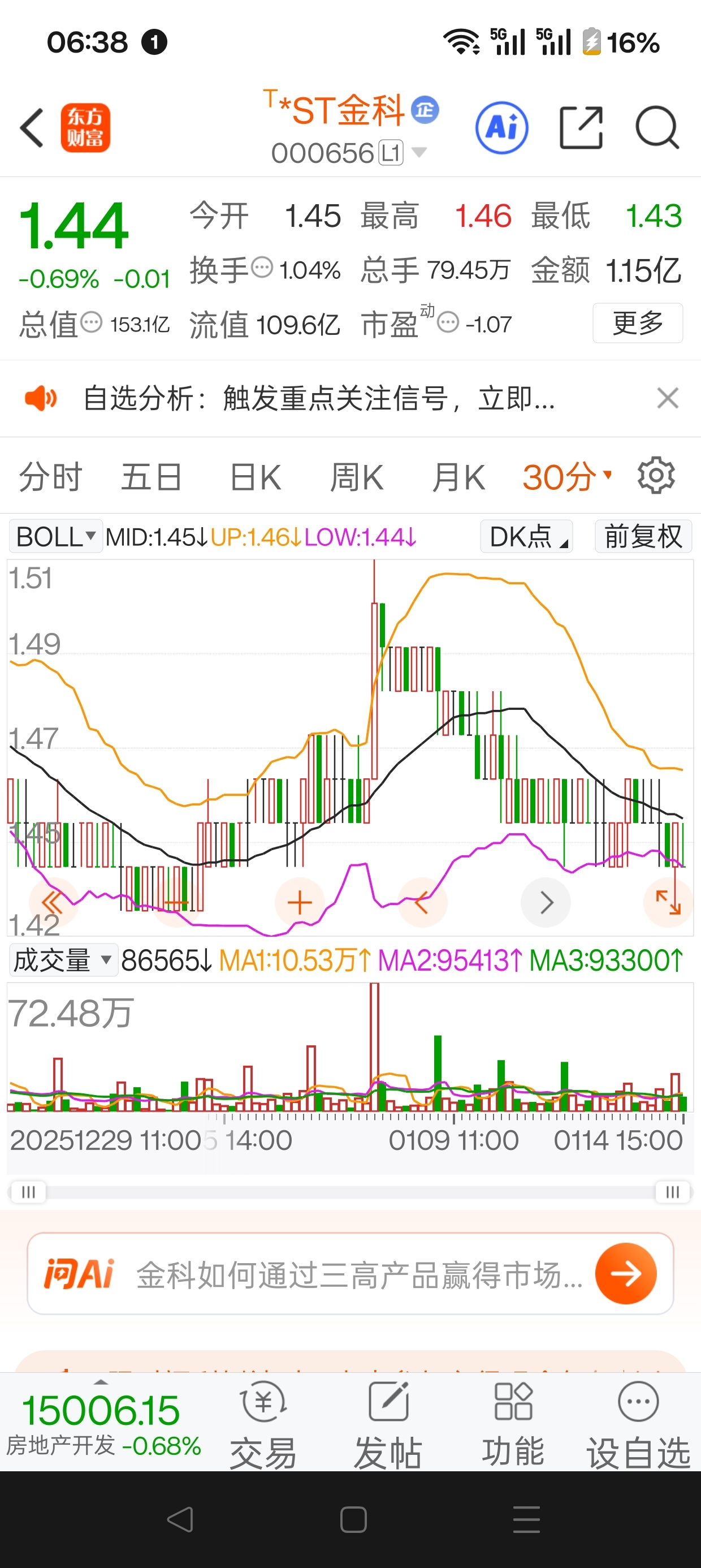 金科十五号是要涨停的。可以买入了。