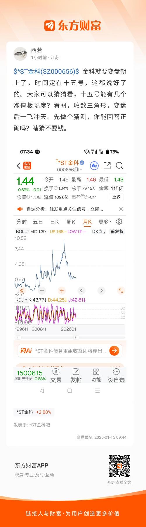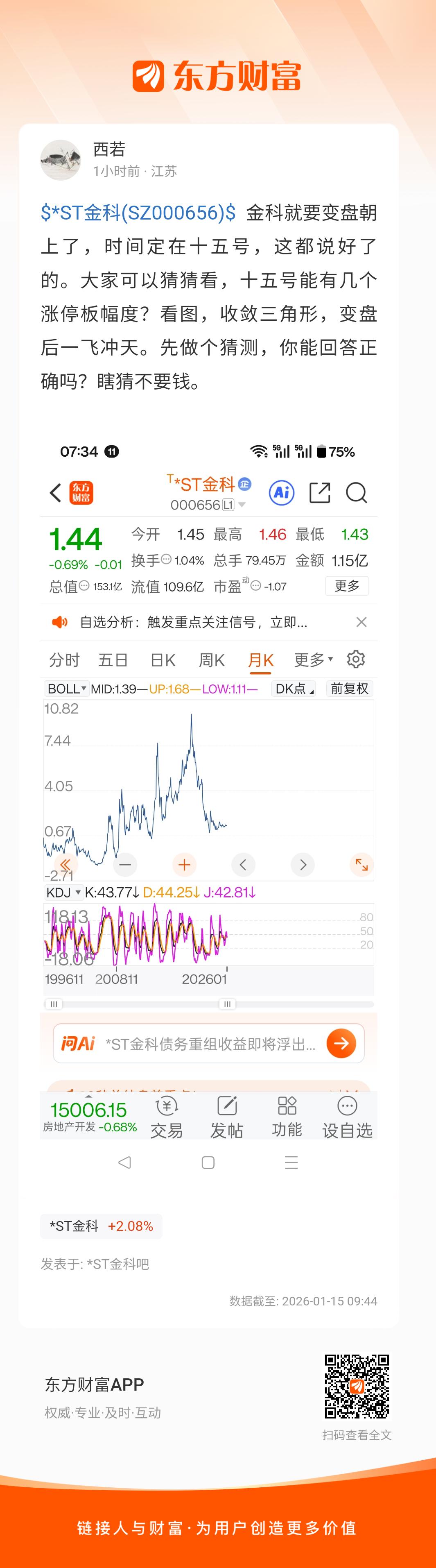 $*ST金科(SZ000656)$ 金科就要变盘朝上了,时间定在十五号,这都说好了的。大家可以猜猜看,十五号能有几个涨停板幅度?看图,收敛三角形,变盘后一飞冲天。先做个猜测,你能回答正确吗?瞎猜不要钱。
