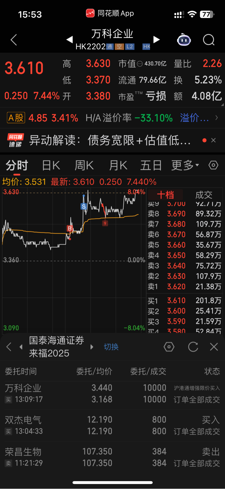 $*ST金科(SZ000656)$ $万科企业(HK|02202)$ 这个尾盘为啥抢筹这么多啊,今天搞了一点万科企业,明天看有没有机会来金科