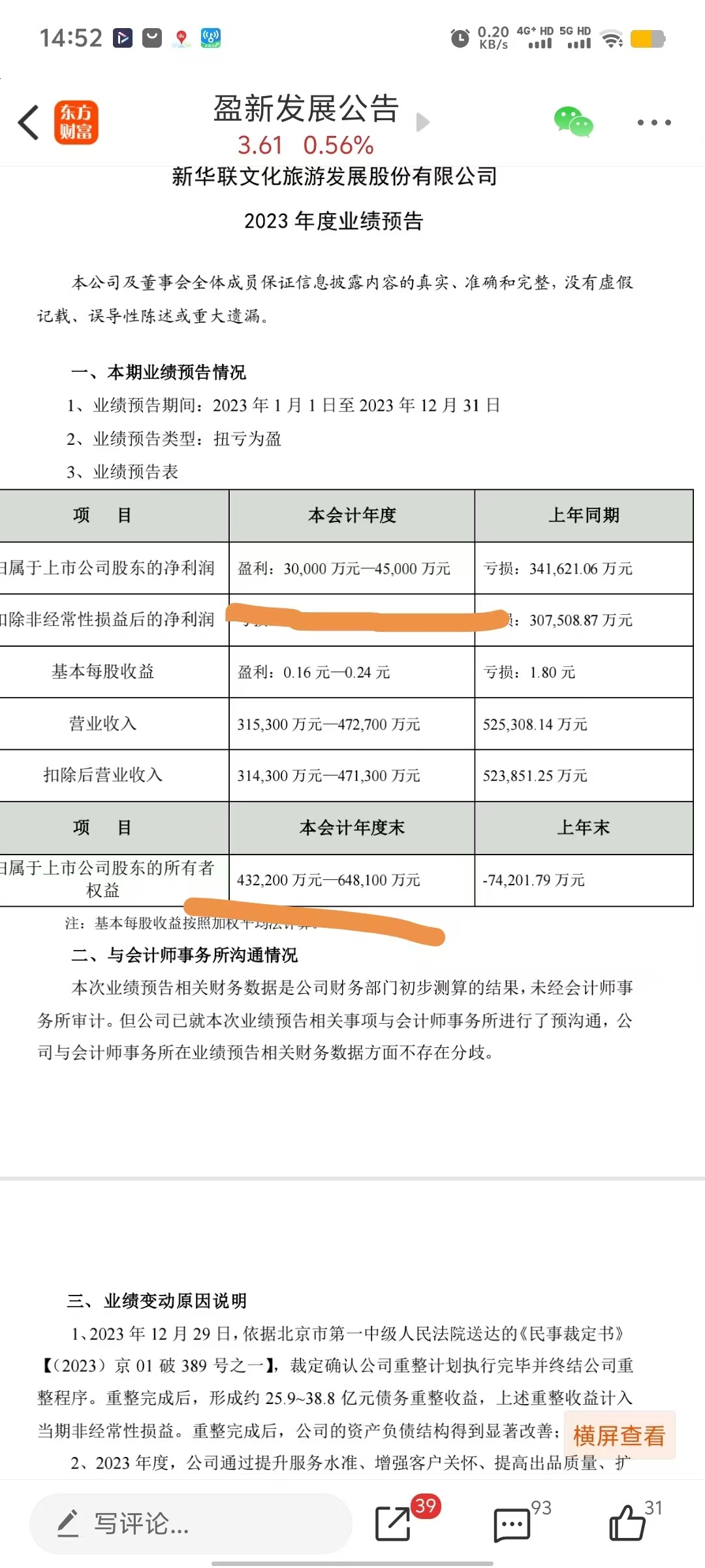 下面是新华联2023年底重整完成后2024年1月30日的年报预告