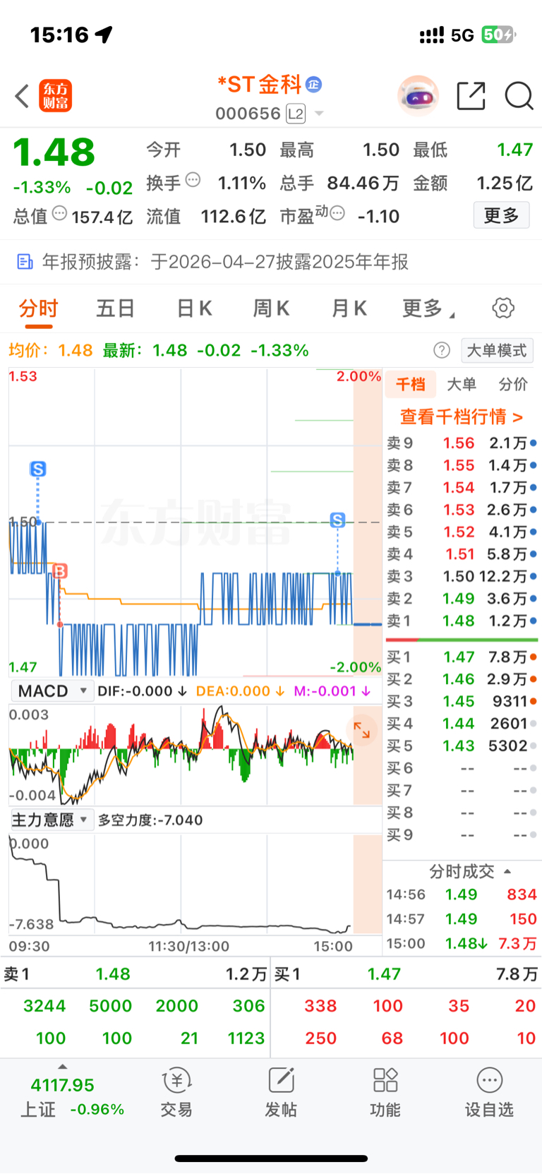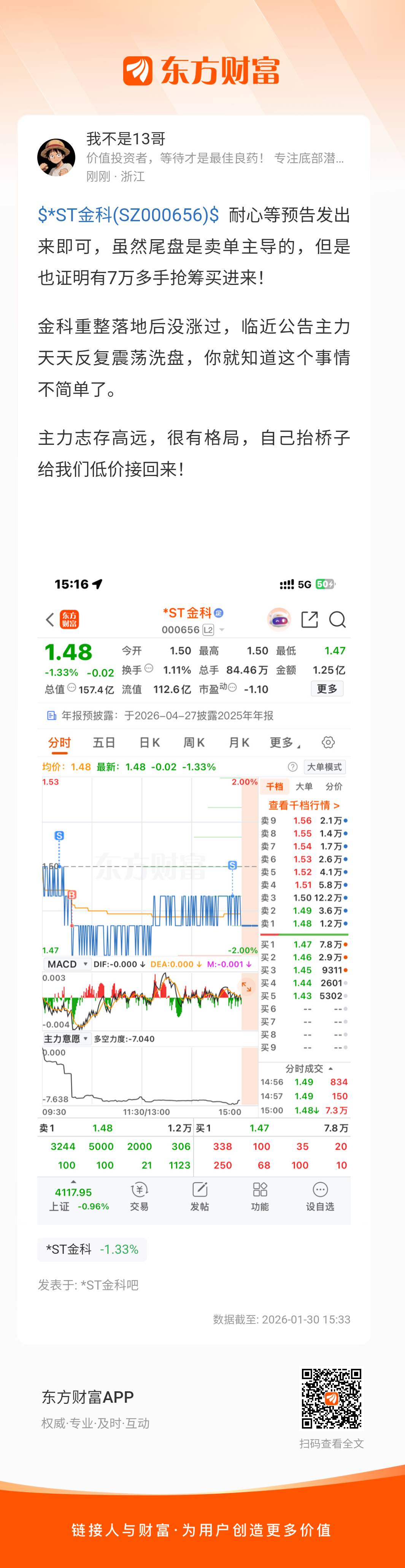 $*ST金科(SZ000656)$ 耐心等预告发出来即可,虽然尾盘是卖单主导的,但是也证明有7万多手抢筹买进来!