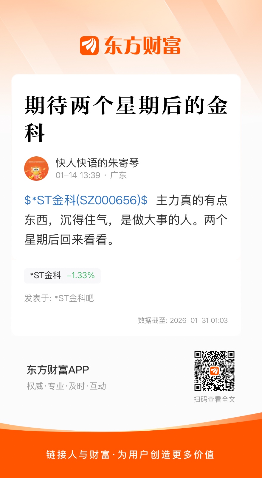 $*ST金科(SZ000656)$  主力真的有点东西,沉得住气,是做大事的人。两个星期后回来看看。