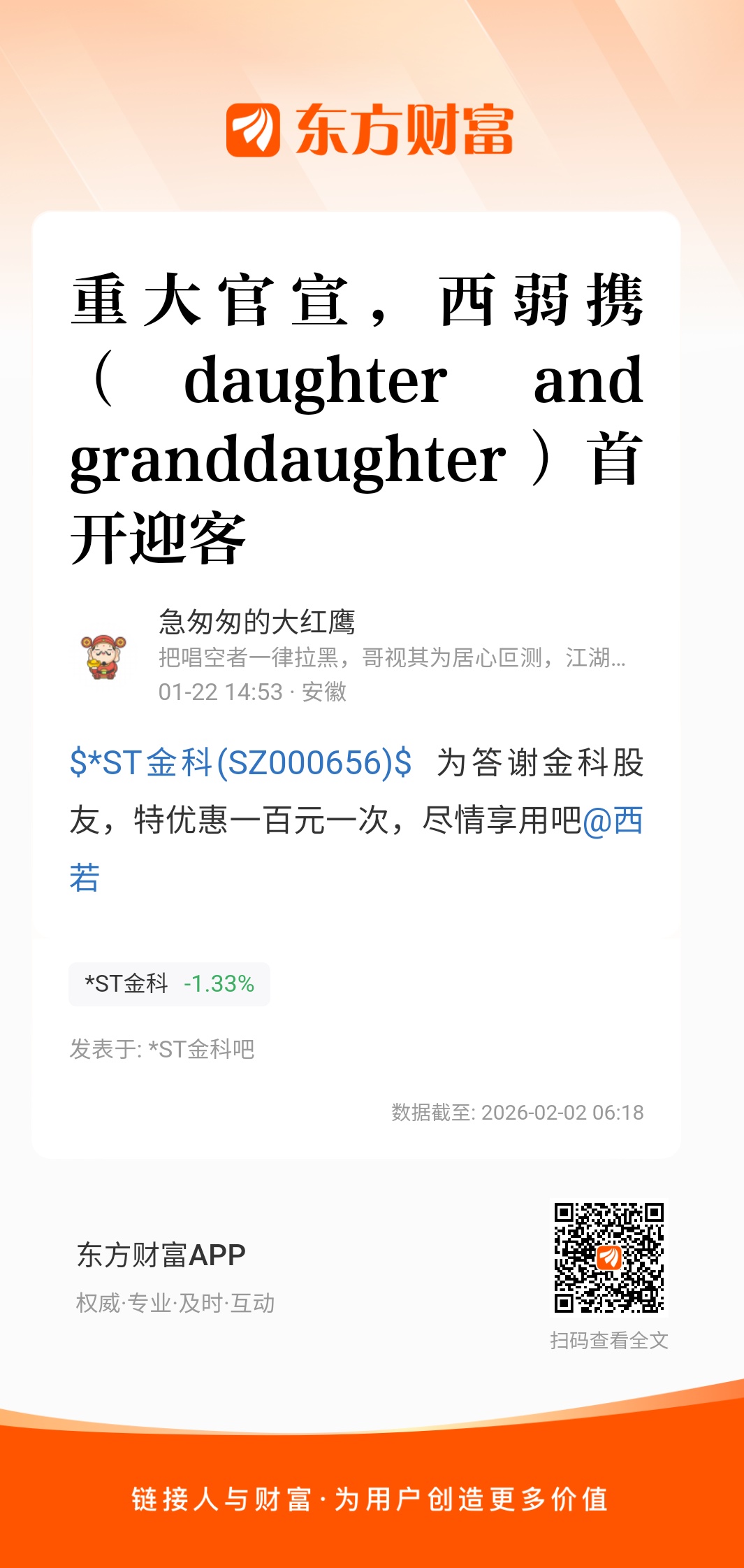 $*ST金科(SZ000656)$  为答谢金科股友,特优惠一百元一次,尽情享用吧@西若