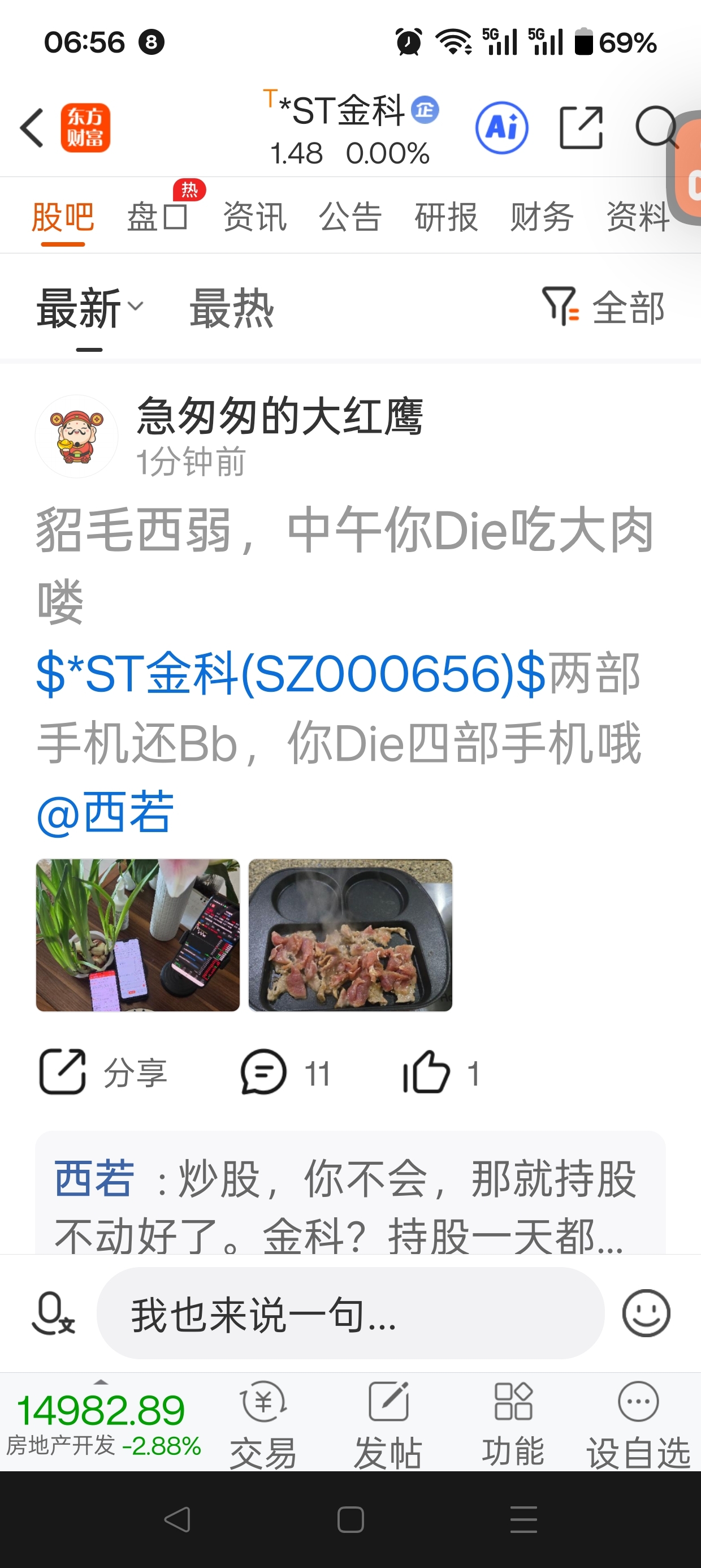 $*ST金科(SZ000656)$ 我们只关心股价涨跌,你赚不赚钱跟他人没有半毛关系啊。他人赚不赚钱,跟你也没关系。你说你不关注股价涨跌,尽关心这些破事,难怪炒股不行呢。玩金科就要这样嘛,周五买入,周一卖出就行了。做个示范。