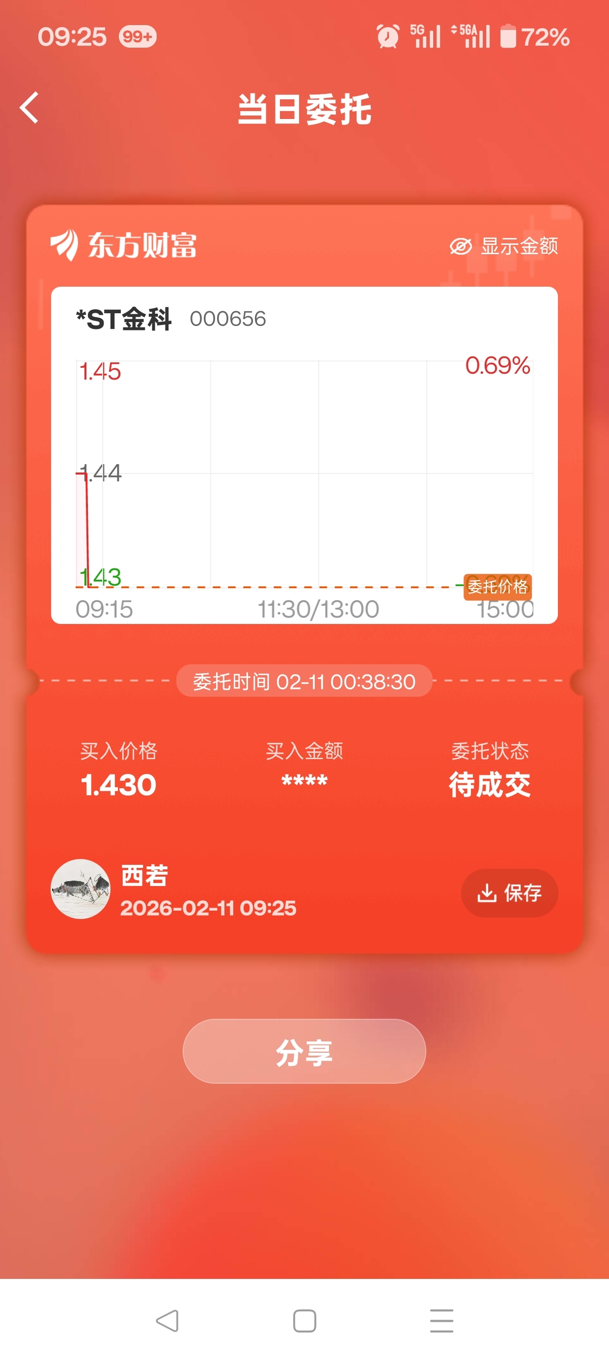 $*ST金科(SZ000656)$ 买入1.43,没买到。难了,应该挂单1.44卖,就会开盘买到1.43了。